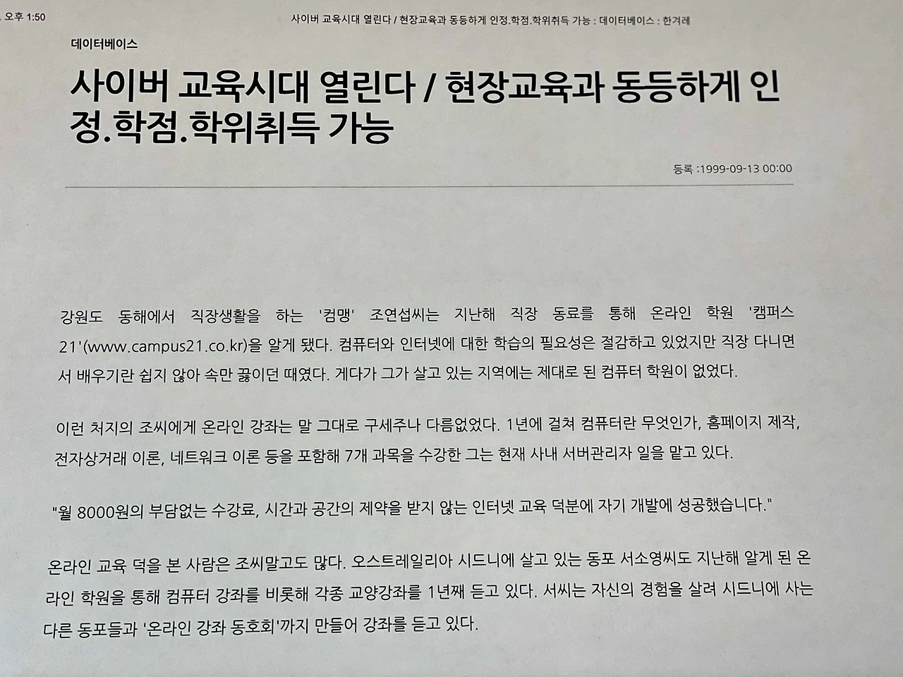 필자는 26년 전 시작한 컴퓨터 교육도 그랬다. 절실했기 때문에 독학으로도 컴퓨터의 재미를 느끼게 됐고 이어가는 이유가 됐다. 인터넷 1세대 컴퓨터 학교 <캠퍼스 21>에 진학해 학교 모델 활동, 홈페이지 제작, 서버구축 등 웹 1세대로 컴퓨터 공부를 지독하게 시작했다. 이후 서버까지 구축하는 등 분야의 전문성을 갖춰가게 됐다. 이런 여러 가지 이유로 늘 컴퓨터랑 놀기를 즐겼다. 케이블 TV를 준비하던 유선방송사 근무시절, 대표이사는 컴퓨터랑 잘 지내는 필자가 컴퓨터 실력자로 착각하고 방송실장과 인터넷 팀장직을 겸한 관리자로 발령을 명했다. 초고속 인터넷이 광케이블로 바뀌면서 속도가 고속으로 전환되던 시기 어쩔 수 없이 초고속 인터넷 팀장 활동도 담당했지만 전문성 부족으로 새로운 도전은 또 시작됐다.(직장인인지 학생인지 모르겠다)