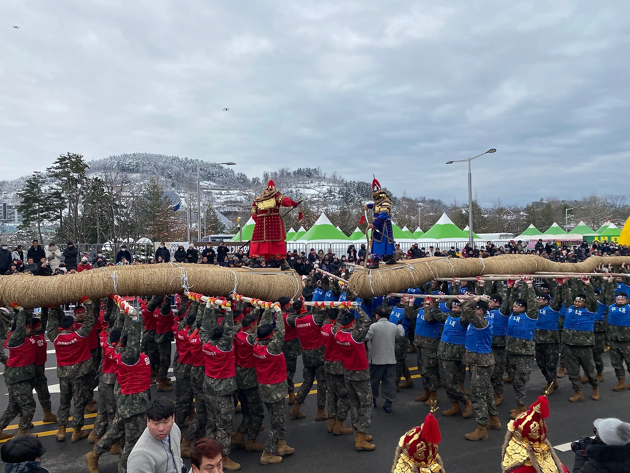 내린 눈은 그치고 가랑비가 오락가락하다 개인 날씨다. 현장은 두 개의 앞 뒤 무대에서 행사준비가 한창이다. 한쪽은 천신제를, 한쪽은 새끼로 기줄을 만들기 위한 술비놀이와 기줄다리기 준비로 벌어지는 팔씨름대회로 이웃들과 관계자들은 인산인해다. 유네스코 문화유산으로 등재된 고을형 대동놀이 민속, 삼척 기줄다리기는 이축제에 있어서 야명주처럼 대보름을 밝혀준 킬러콘텐츠다.
