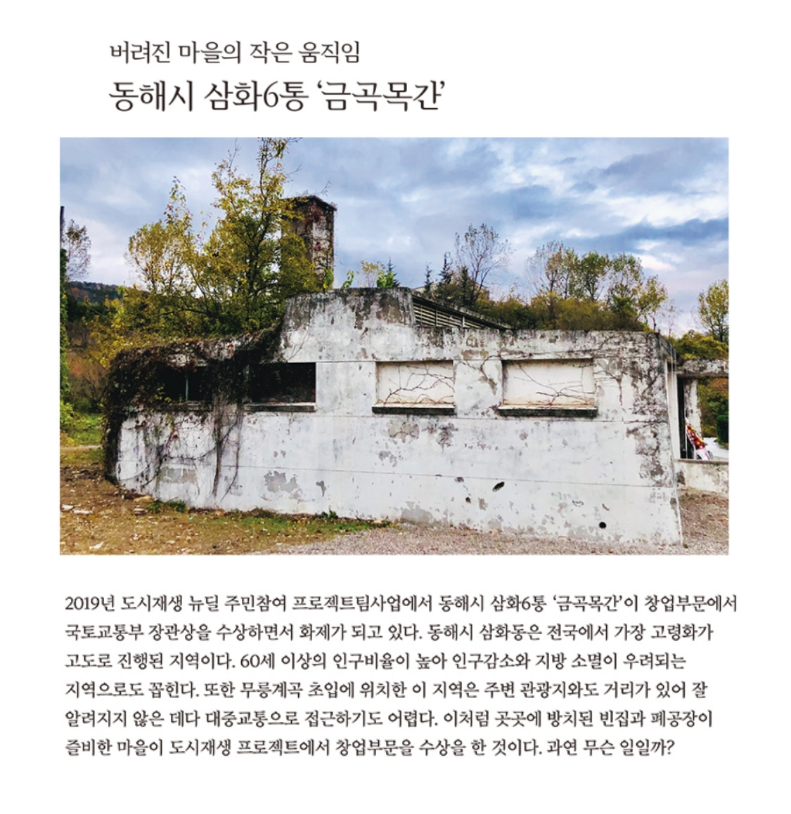 금곡목간은 2019년부터 쌍용 C&E 동해공장 폐 목욕탕을 ‘목간’(목욕의 방언) 이름을 붙여 금곡목간으로 명명하고 마을주민, 동해문화원 청년기획단, 지역 청년활동가들이 추진한 마을 만들기 프로그램이다. 야학 등 인문학 교실, 마을의 호박돌을 활용해 어르신 자서전 프로그램, 마을주민 화가 만들기 공공 미술 프로그램, 특산품 마늘 활용 프로그램 등 마을 기반 프로그램을 약 5년 진행해 국토교통부 장관상까지 수상했다.