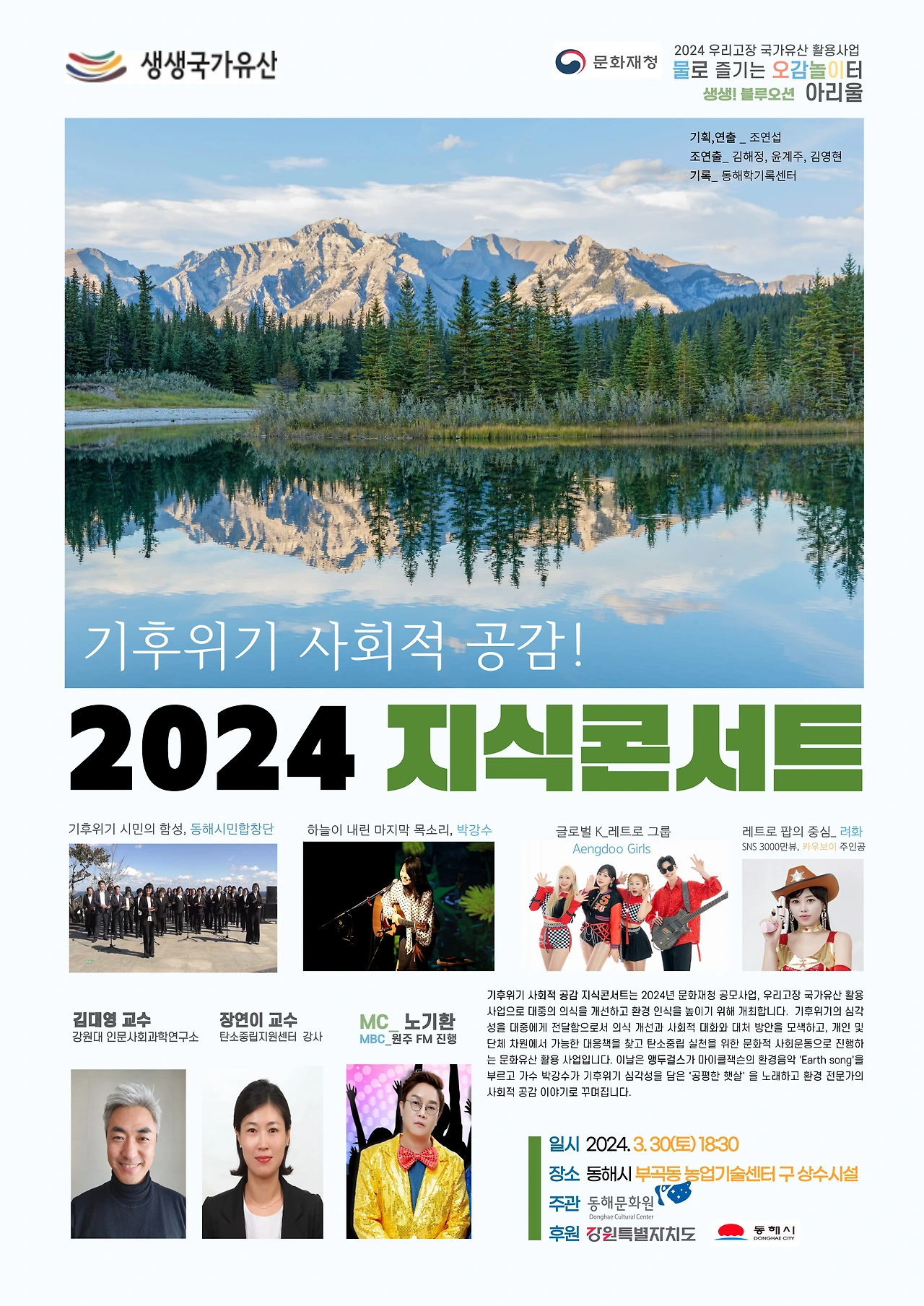 동해문화원이 주관하고 문화재청, 강원특별자치도, 동해시가 후원하는 「2024 기후위기 사회적 공감, 지식콘서트」가 30일 오후 6시 30분 동해시 부곡동 농업기술센터 구 상수 시설 광장 상설무대에서 개최된다.