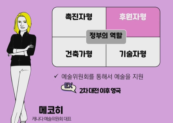 '해리힐만_차트랜드' 교수와 캐나다예술위원회 대표 '메코희'교수의 <문화적 지원에 관한 4가지 모델>은 국가가 문화예술을 지원하는 네 가지 주요 방식을 설명한다. 각 모델은 특정 국가의 문화정책과 밀접하게 연관되어 있다: