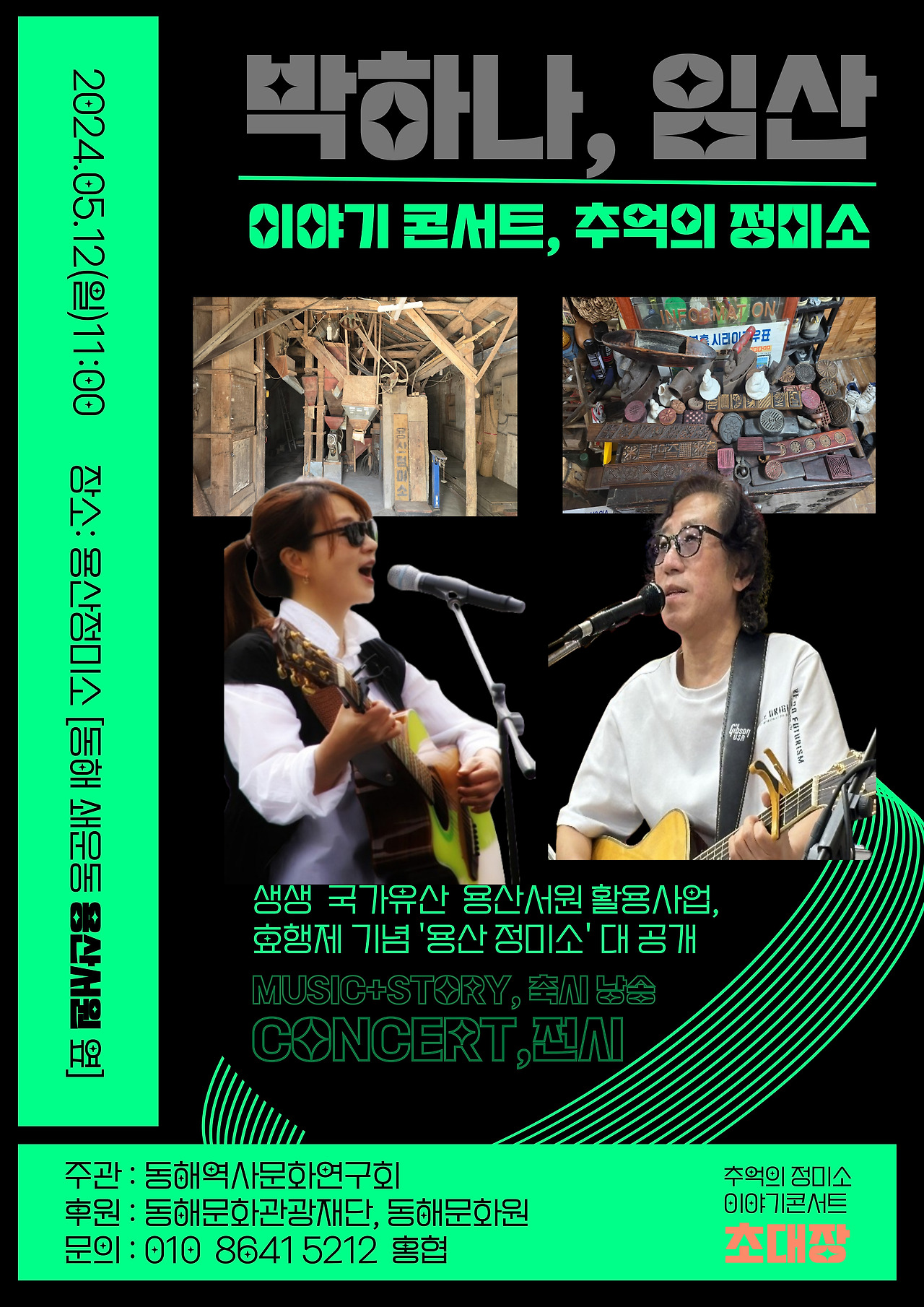5월 12일 일요일 오전 11시, 동해 쇄운동 용산서원 옆에 위치한 45년 역사를 자랑하는 '용산정미소’에서 특별한 콘서트가 개최된다. 이번 콘서트는 '이야기콘서트, 추억의 정미소’라는 주제로 진행되며, 가수 박하나와 임산이 출연한다.
