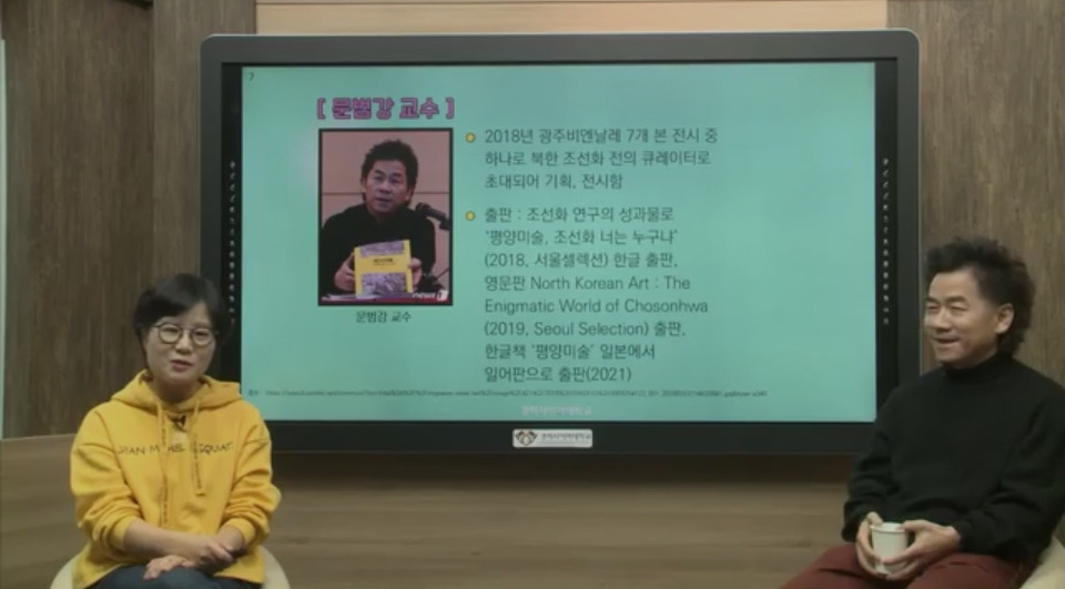 북한 미술 대가 문범강 교수(조지타운대학교 미술학과)는 경희사이버대학교 대학원 문화예술경영학전공 강윤주 교수가 강의하는 '사회적 예술론'의 '분단미술' 주제 강의 인터뷰에 출연해 북한미술 조선화의 표현방식은 ‘사실주의’ 미술이며 주로 인민의 생활상을 표현하며 사실주의로 성장해 온 것이 특징이라고 했다.