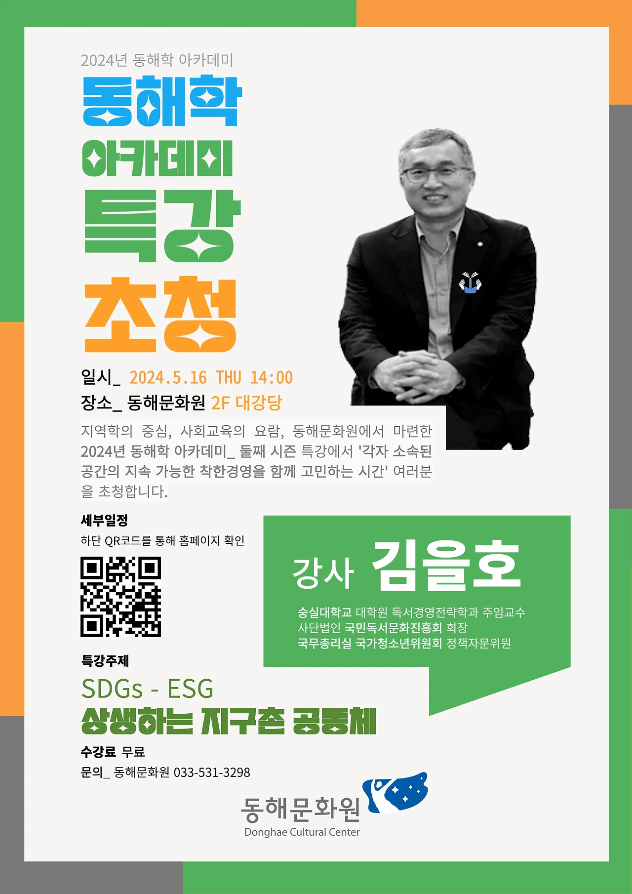 2024년 동해학 아카데미 5월 둘째 특강으로 ‘독서 대통령, 김을호 교수’를 초청해 특강을 마련한다. 동해문화원 주관으로 16일 목요일 오후 2시 2층 대강당에서 열리는 이번 특강의 주제는 ‘SDGs_ESG, 상생하는 지구촌 공동체’로 지역사회와 함께하는 지속 가능성과 환경 실천을 근간으로 착한 경영을 논의하는 시간이다.