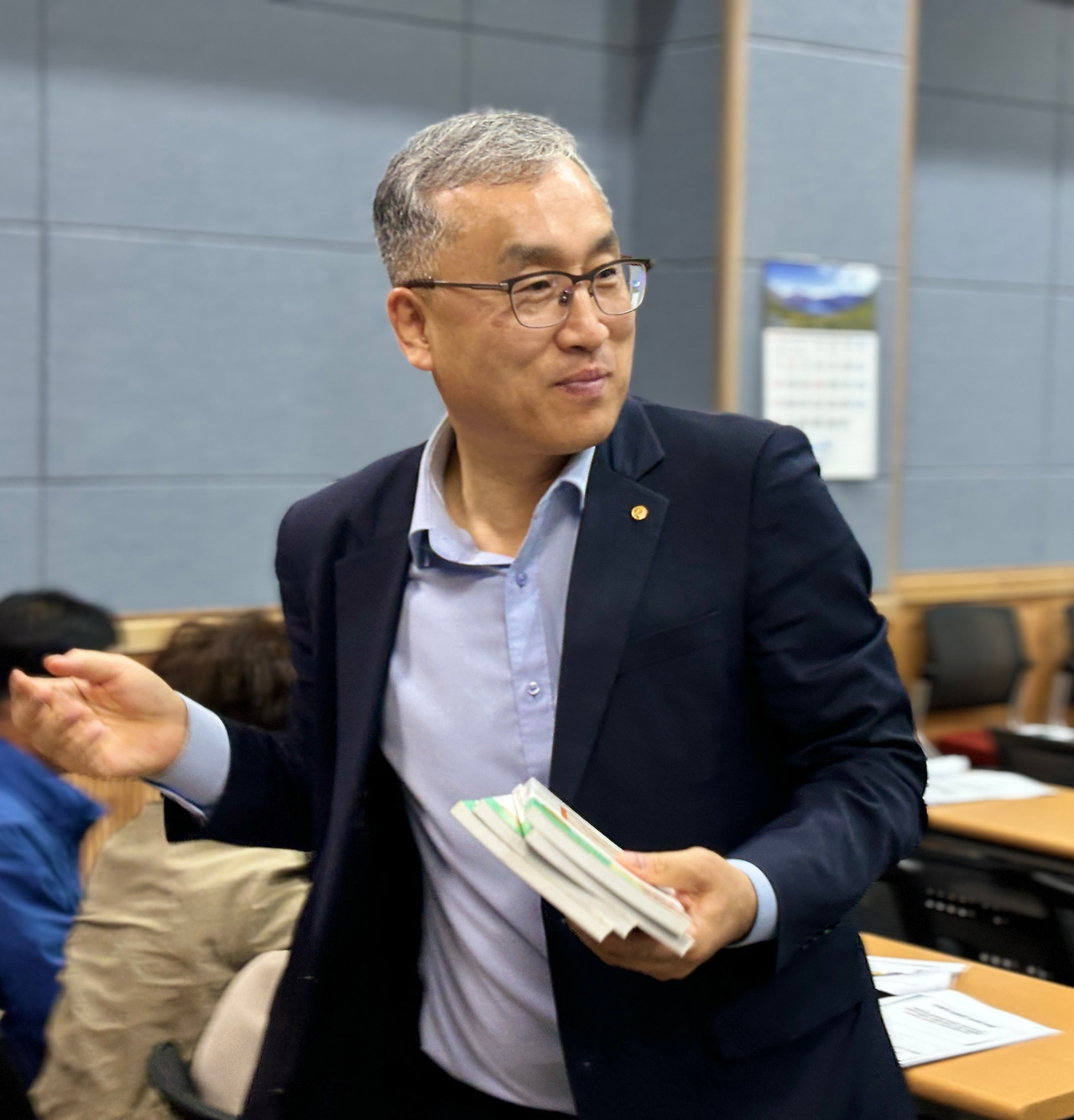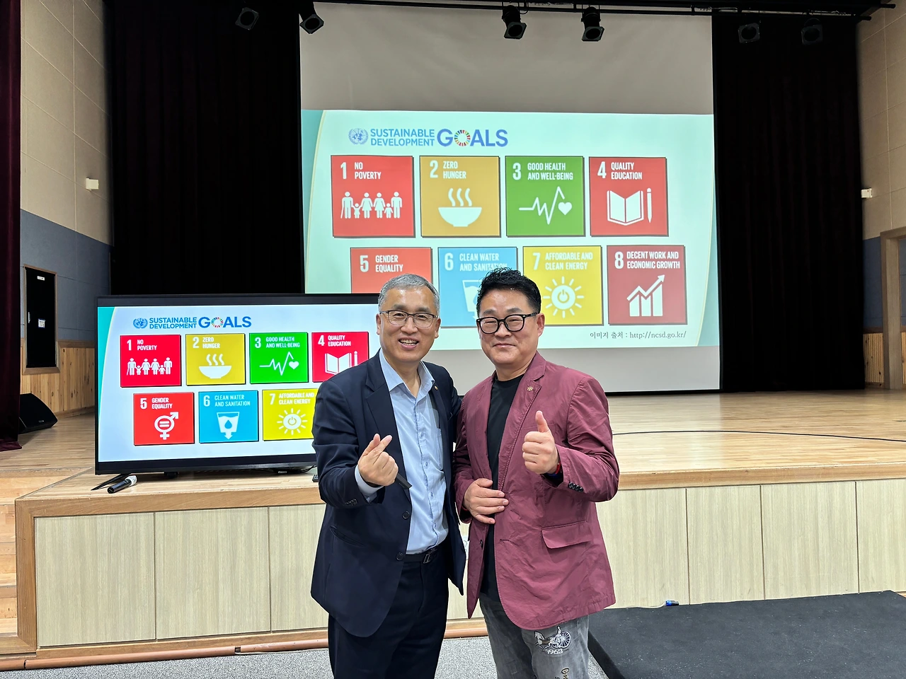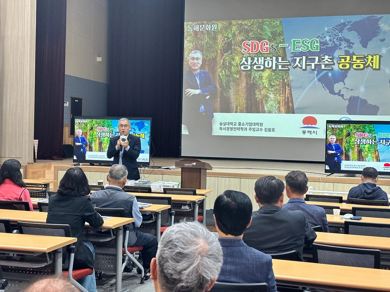 오늘 강사는 국민 강사 독서대통령 김을호 교수다. 교수는 우리 시의 협력관이기도 하다. 라디오 프로그램 진행자이기도 한 김 교수는 가수 영탁 CD, 폰카시 주제의 책, 기능성 비누 등 방송에서 후원받은 다양한 선물을 준비하고 ‘으쓱’, ‘으쓱’ 하면서 ‘ESG 별거 아니야, SDGs 별거 아니야 ‘를 여러 차례 자신 있는 큰 목소리로 반복하며 강의는 본론으로 들어갔다.