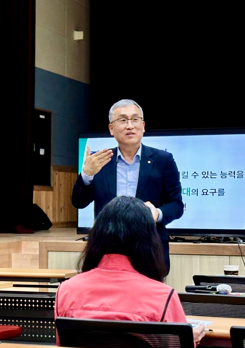 ‘SDGs_ ESG, 상생하는 지구촌 공동체’의 무거운 주제로 강의에 나선 강사는 ESG 기억을 위해 에스기, 으쓱 등 주제 상징 독특한 모두발언으로 이어지는 테크니컬 한 언어와 역동적인 제스처로 무거운 주제를 뛰어넘는 분위기로 톡톡 튀는 강의를 시작했다.