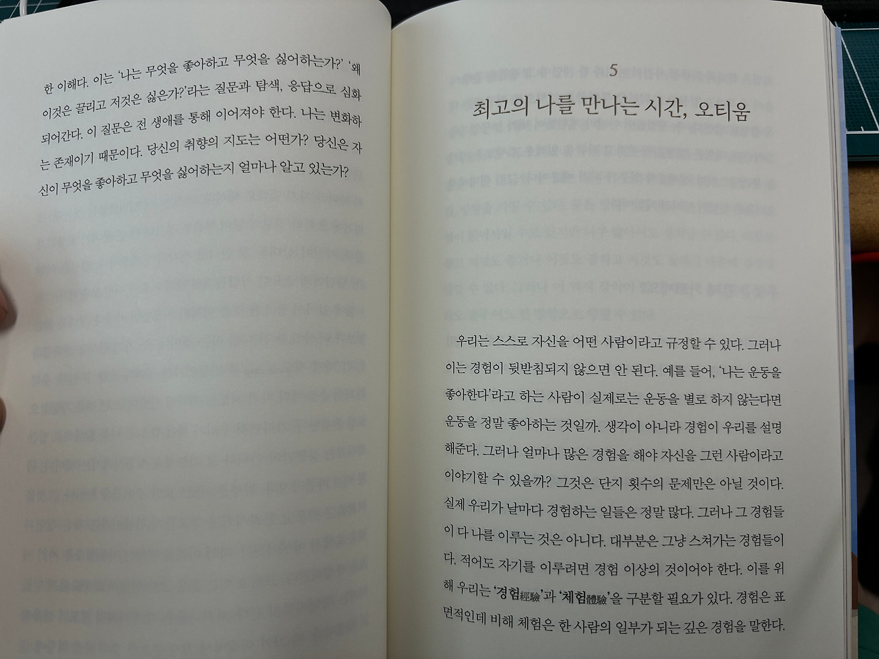 문요한의 책 '오티움'은 살아갈 힘을 주는 나만의 휴식은 현대인이 진정한 휴식을 찾고 삶의 활력을 되찾기 위한 방법을 제안한다. "오티움"은 단순한 쉼을 넘어서, 자신의 삶을 풍요롭게 하는 능동적 여가 활동을 의미한다. 책에서는 오티움의 다섯 가지 기준을 '자기 목적적', '일상적', '주도적', '깊이', '긍정적 연쇄효과'를 꼽으며 여가시간, 역시 깊이가 있어야 하고 일상적이며 연결적 사고 지속성이 중요함을 알려줬다.