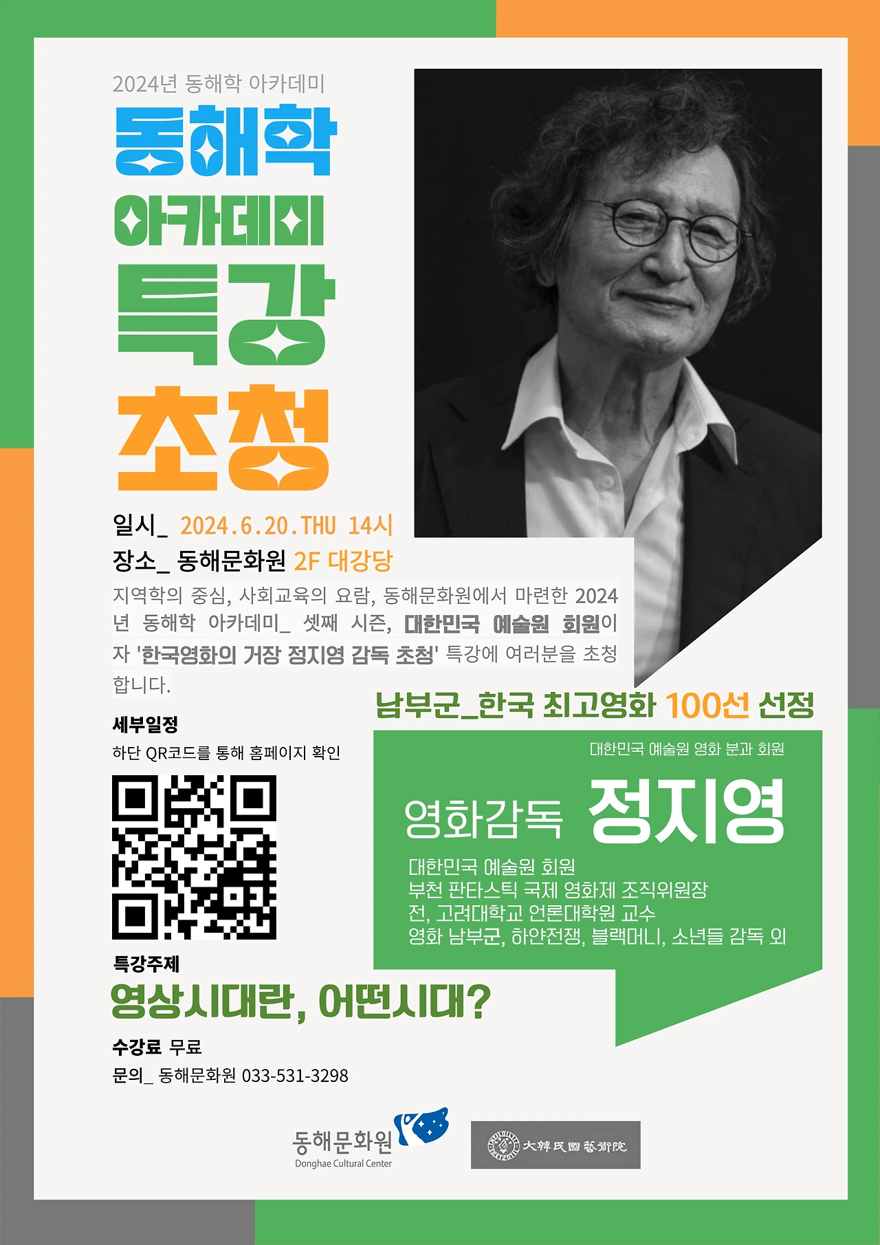동해문화원은 오는 6월 20일 오후 2시에 한국 영화의 거장 정지영 감독 초청 특강을 실시한다. 이번 특강은 동해문화원의 2024년 동해학 아카데미 세 번째 클래스로, "영상시대란, 어떤 시대인가?"를 주제로 진행한다.