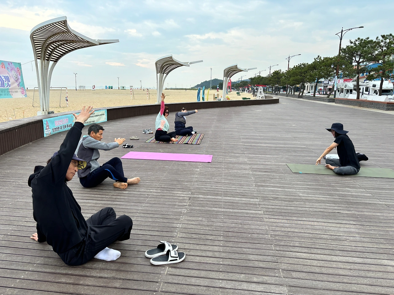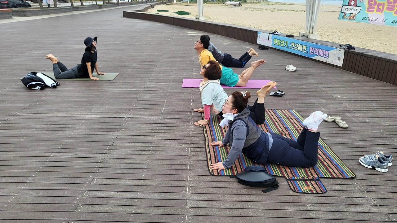 매주 토요일, 일요일 아침 8시, 동해 망상해변은 요가와 해변 맨발 걷기 만남지로 변신한다. 이번 주 토요일은 예상된 비로 인해 우리는 모임을 일찍 6시에 시작하기로 했다. 이날 참석한 사람들은 다양한 배경을 가진 분들이었다. 특히 필드하키 선수로 체육 교사 출신인 우광원씨는 스포츠에 열정적인 분으로 정년퇴직 후에도 여전히 활동적인 삶을 즐기고 있었다. 다른 한분은 동해문화원 난타반 회장이자 농장을 운영하는 어르신이었는데, 그 어르신은 이날 처음 맨발 걷기에 도전했고, 그의 행복한 미소가 참석자들을 감동시켰다.