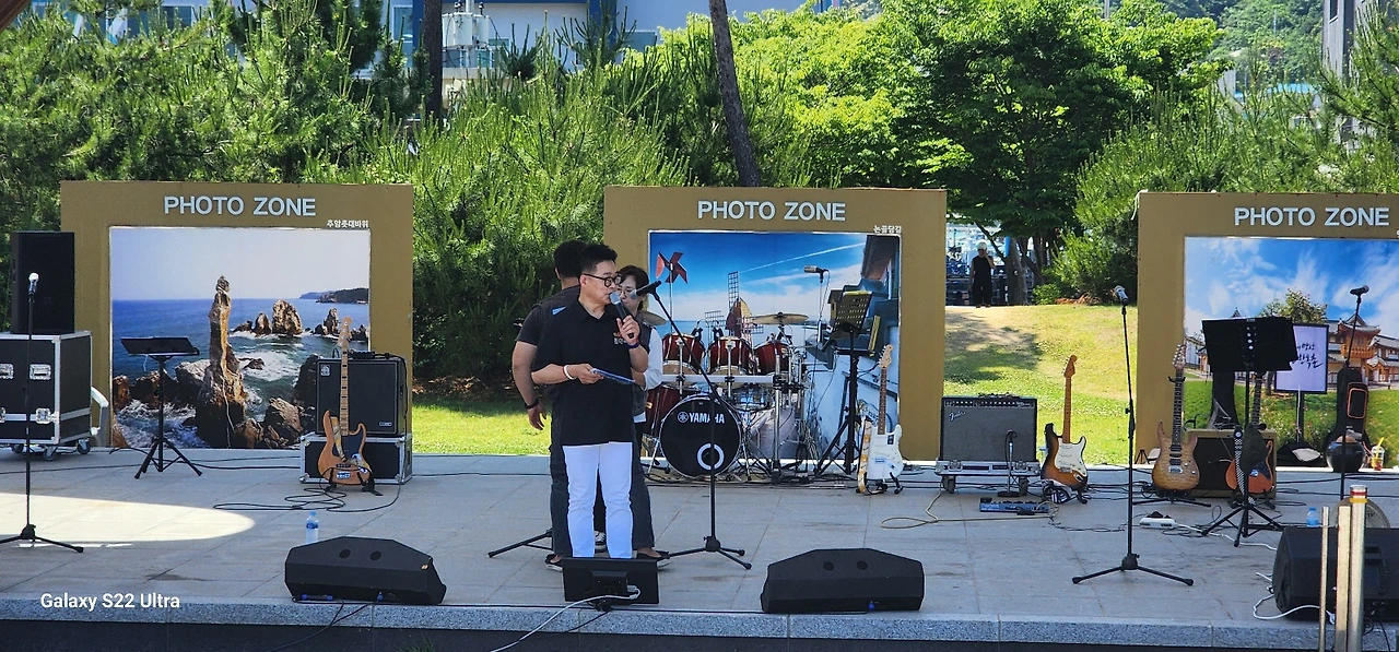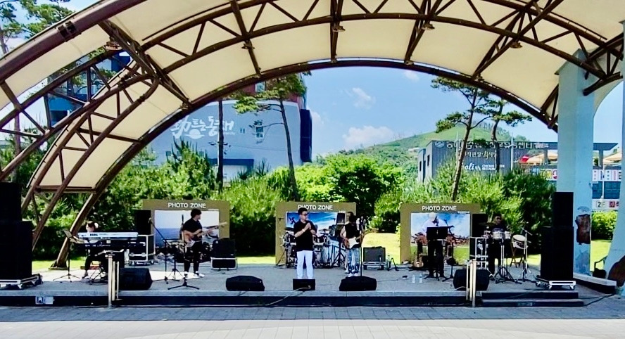 고개를 들면 논골담길이 보이는 동해 묵호 수변공원 상설무대에서 '동해밴드' 음악회를 개최했다. 청주, 분당, 서울에서 찾아온 여행자들과 동해밴드의 라이브 공연이 시작됐다. 음악회의 시작은 초청가수 이우리의 트위스트로 시작했다. 음악회는 최근 트롬본, 트럼펫 연주자와 새로운 레트로 라이브 분위기 장르를 개척하고 있는 나팔수 가수 나팔박, 가수 이우리, 키보드, 플루트 등 전문 세션가 장희정, EDM_DJ 황윤규 등이 게스트로 나서 다양한 프로그램으로 함께했다. 이날의 주인공 동해밴드는 울산아마추어 직장인밴드 대회 등 전국 아마추어 직장인밴드 대회에서 좋은 성적을 거둔 이름난 밴드로, 그 명성에 걸맞게 이번 공연 역시 큰 호응을 얻었다. 진행자로 초청받은 필자는 몇 해 전까지 망상해변에서 직장인밴드의 로망의 무대로 불렸던 '대한민국직장인밴드 동해콘서트'를 4년간 개최했던 경험이 있다. 그래서 이번 묵호에서의 공연은 특별한 의미가 있었다.