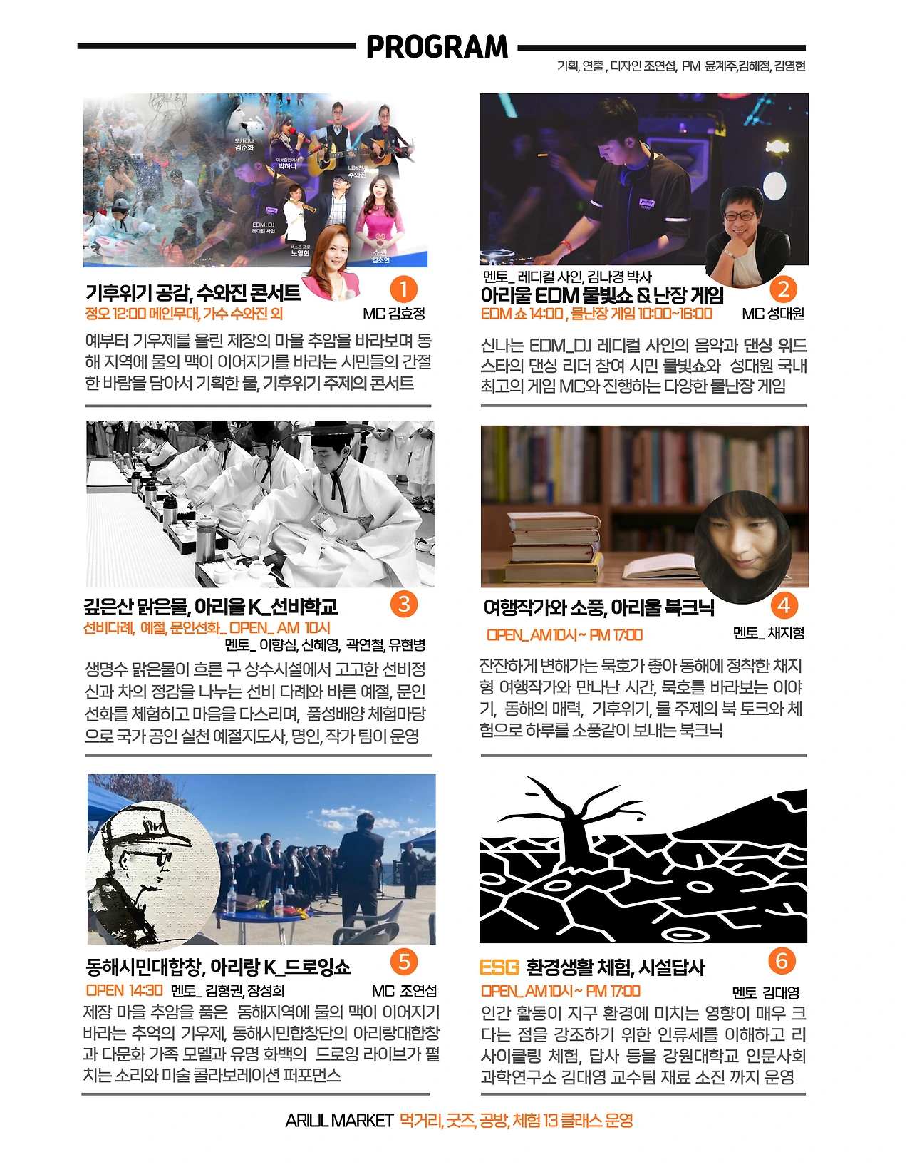 이날 개최할 프로그램은 물과 기후 위기를 주제로 꾸몄으며 가족 참여형 체험과 게임, 공연 등 교육형 프로그램이 특징이다. 오전 10시 게임존의‘물 난장 게임’을 시작으로 가수 수와 진, 나팔박, 양선호, 박하나와 연주자 김준화, 노영현이 참여하는 기후 위기 공감, 수와 진 콘서트가 도시락 콘서트로 개최되며, 이어 오후 2시 대형 에어바운스에서는‘EDM_DJ와 댄싱 스타 리더들의 신나는 음악과 물빛 쇼’가 이어지고. 다문화가족 모델과 중견 화백, 시민합창단의 아리랑 대합창이 함께하는 물의 맥 잇기‘아리랑 K_드로잉쇼가 이어진다. 체험 행사도 다양하다. 차 문화로 생명수의 소중함을 알리는 선비 다례와 예절, 문인선화가 펼치는 ‘선비학교', 여행작가와 함께하는 아리울 북 크닉, ESG 환경 생활 체험 교실과 상수 시설 답사, 아리울 마켓 등도 오후 5시까지 각각 진행된다.
