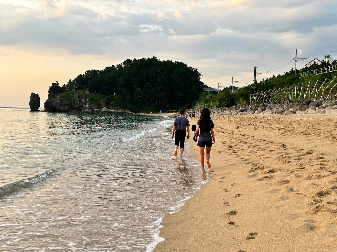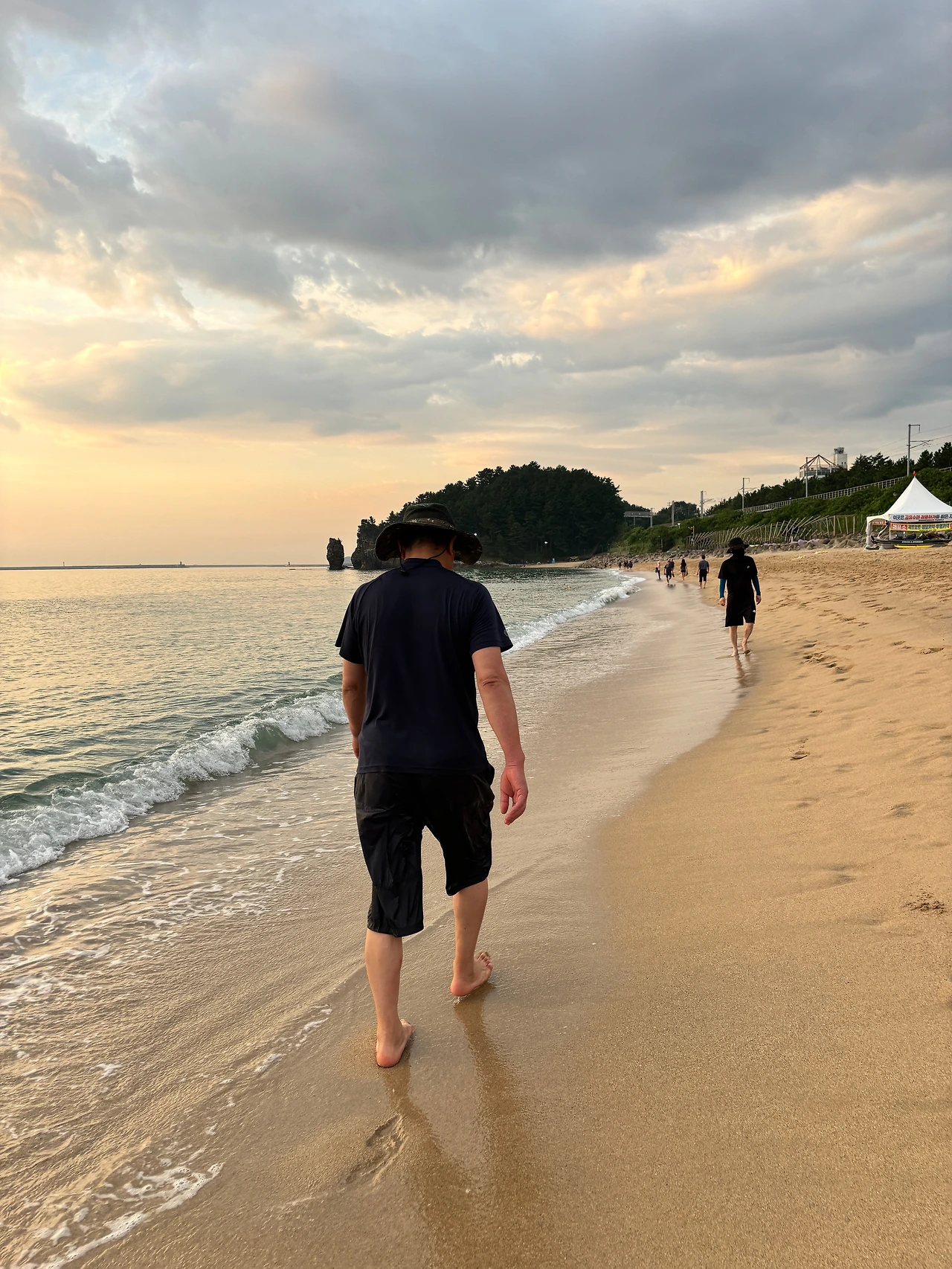 대문을 열자 한여름의 뜨거움 대신, 3.4도나 차이가 나는 상쾌한 공기가 얼굴을 스칩니다. 입추가 지나고 계절이 천천히 바뀌고 있음을 실감하게 됩니다. 이 작은 변화들이 맨발러의 아침을 더욱 특별하게 만듭니다. 늘 같은 루틴으로 맨발 걷기 현장 동해 행복한 섬으로 달렸습니다. 이른 새벽에도 불구 사람들로 북적입니다. 모두들 더 넉넉해진 옷차림으로 해변을 함께 걸어가는 모습이 넉넉해 보이고 시원하게 느껴집니다.
