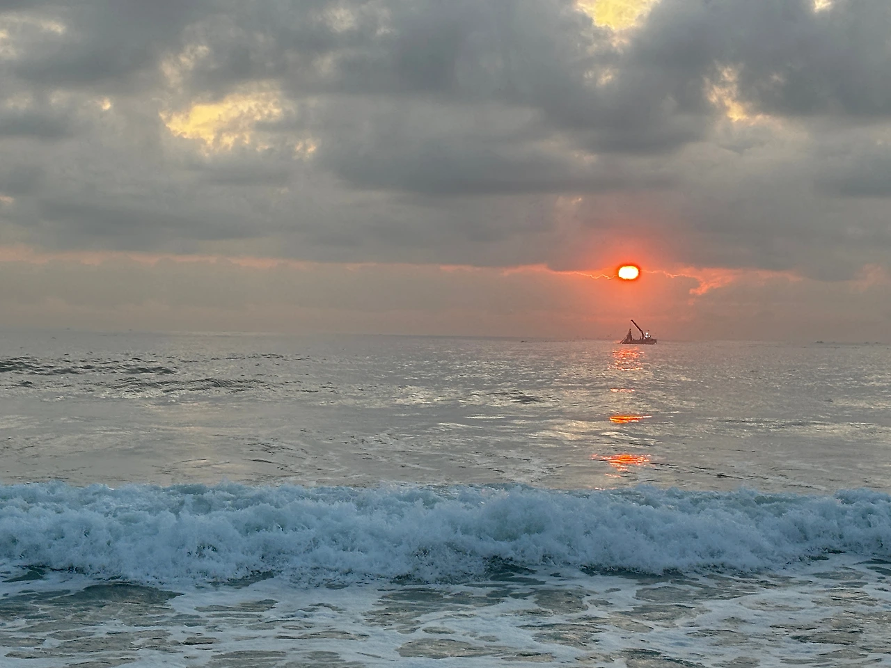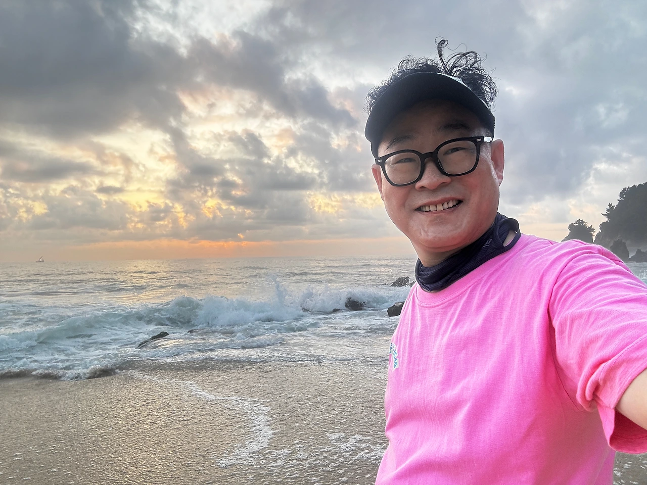동해 해변에서 맨발 걷기 시작한 지 275일 되는 오늘, 거센 파도 소리와 함께 새로운 하루를 맞이했다. 파도는 어제처럼 요란하게 밀려왔지만, 멀리 보이는 작은 고깃배들은 평온하게 그들의 일을 이어가고 있었다. 이곳에서 바라보는 동해의 장엄한 일출은 늘 마음을 울린다. 오늘 아침, 나는 떠오르는 태양이 작은 고깃배를 환하게 비추는 아름다운 풍경을 마주했다.
