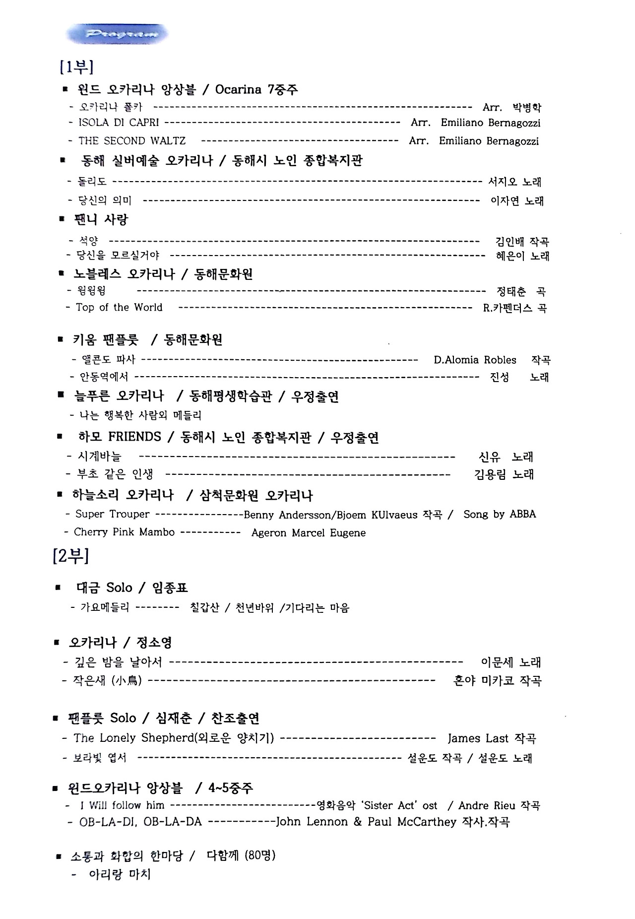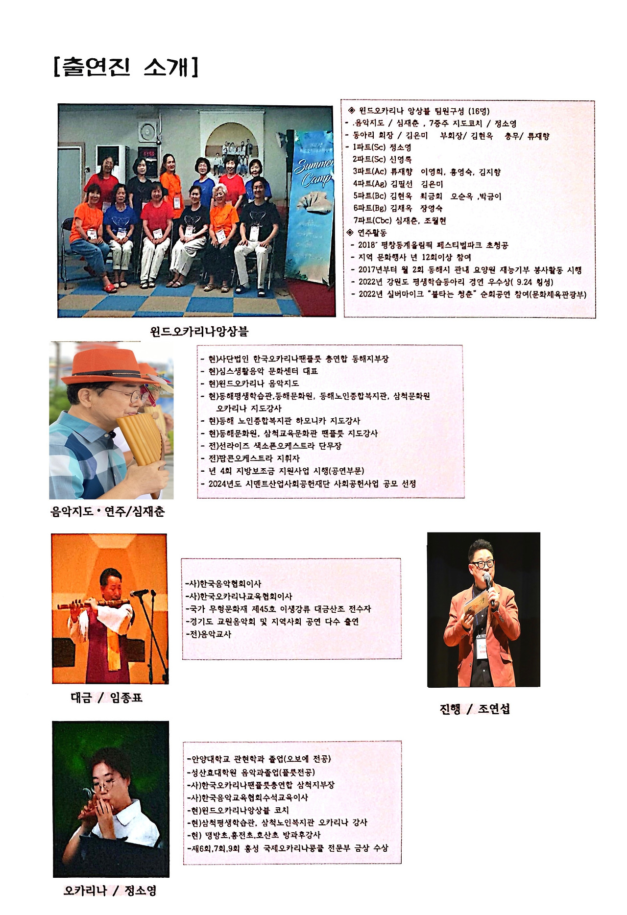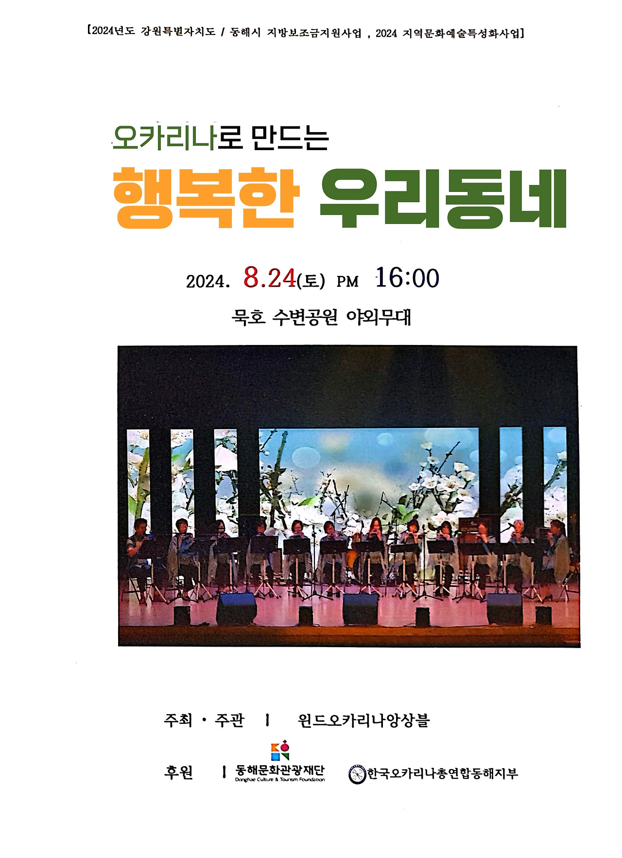 동해, 삼척 오카리나 동호인들이 대거 출연합니다. 토요일 24일 오후 4시, 동해 묵호 수변공원 상설무대에서 열리는 공연에 여러분을 초대합니다. 선한 이웃들이 전하는 아름다운 오카리나 연주와 함께, 우리 모두가 잠시나마 예술가가 되어보는 건 어떨까요? 여러분의 참여가 이 공연을 더욱 빛나게 할 것입니다. 함께하는 순간, 그 자체가 예술이 될 것입니다. 우리 동네의 행복한 소리 속에서 여러분과 만날 수 있기를 기대합니다.