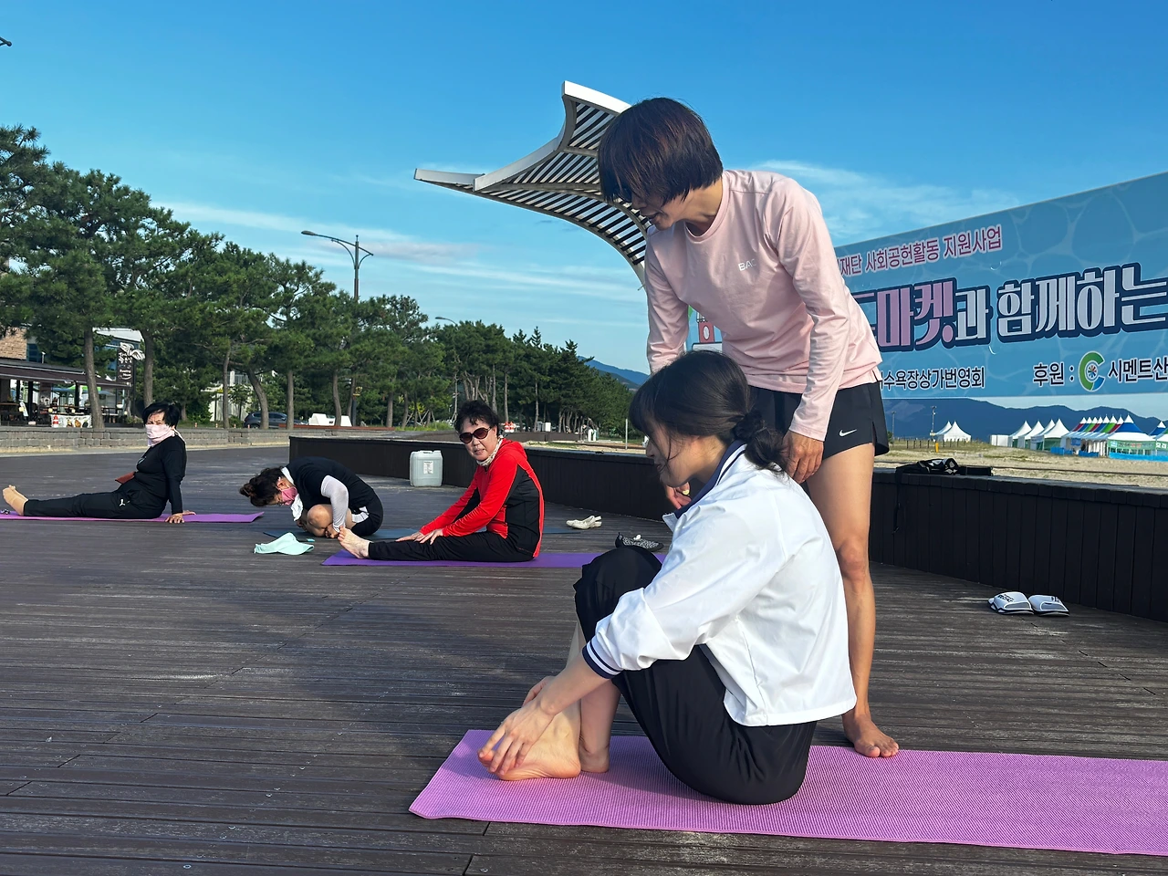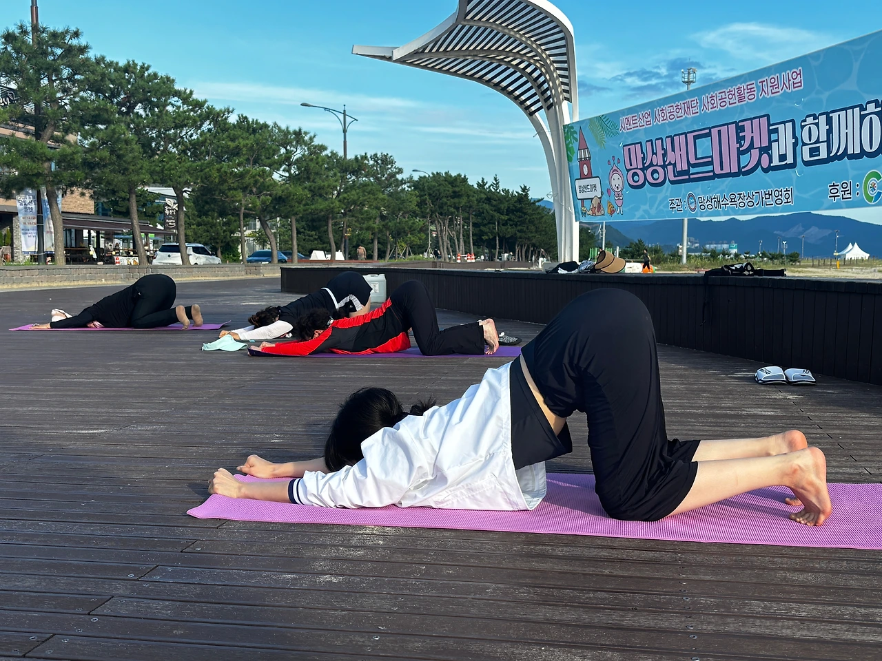 '요가랑 맨발 걷기, 위크앤드 클래스'는 동해의 망상해변과 고래꼬리 광장에서 펼쳐지는 특별한 프로그램이다. ‘맨발 걷기 동해클럽’이 기획한 이 프로그램은 자연과 조화를 이루는 건강한 삶을 추구하며 자발적이고 지속적이며 깊이 있는 맨발러들을 위해 마련되었다. 지난 6월부터 매주 토요일과 일요일, 회원들과 시민들은 이곳에서 몸과 마음을 동시에 가꾸는 시간을 갖고 있다. 8월 3주 클래스도 17일과 18일 각각 진행했다. 인원에 관계없이 자발적이고 지속적이며 깊이있는 맨발 걷기를 목표로 한다.