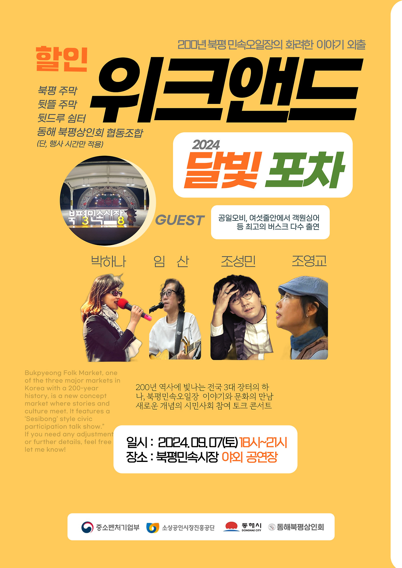 어느새 여름은 가고, 아침저녁으로 시원한 바람이 부는 가을이 다가왔다. 사람들은 일상 속에서 지나간 계절을 아쉬워하며 여운을 되새긴다. 하지만 우리에게는 아직 여름의 추억을 다시 불러올 기회가 남아 있다. 그 기회는 다름 아닌, 북평오일장 주말 밤시장, "위크앤드, 달빛포차"다. 평소 장날만 오가던 장터에서 역사와 이야기를 사고파는 진정한 문화시장이 열린다.
