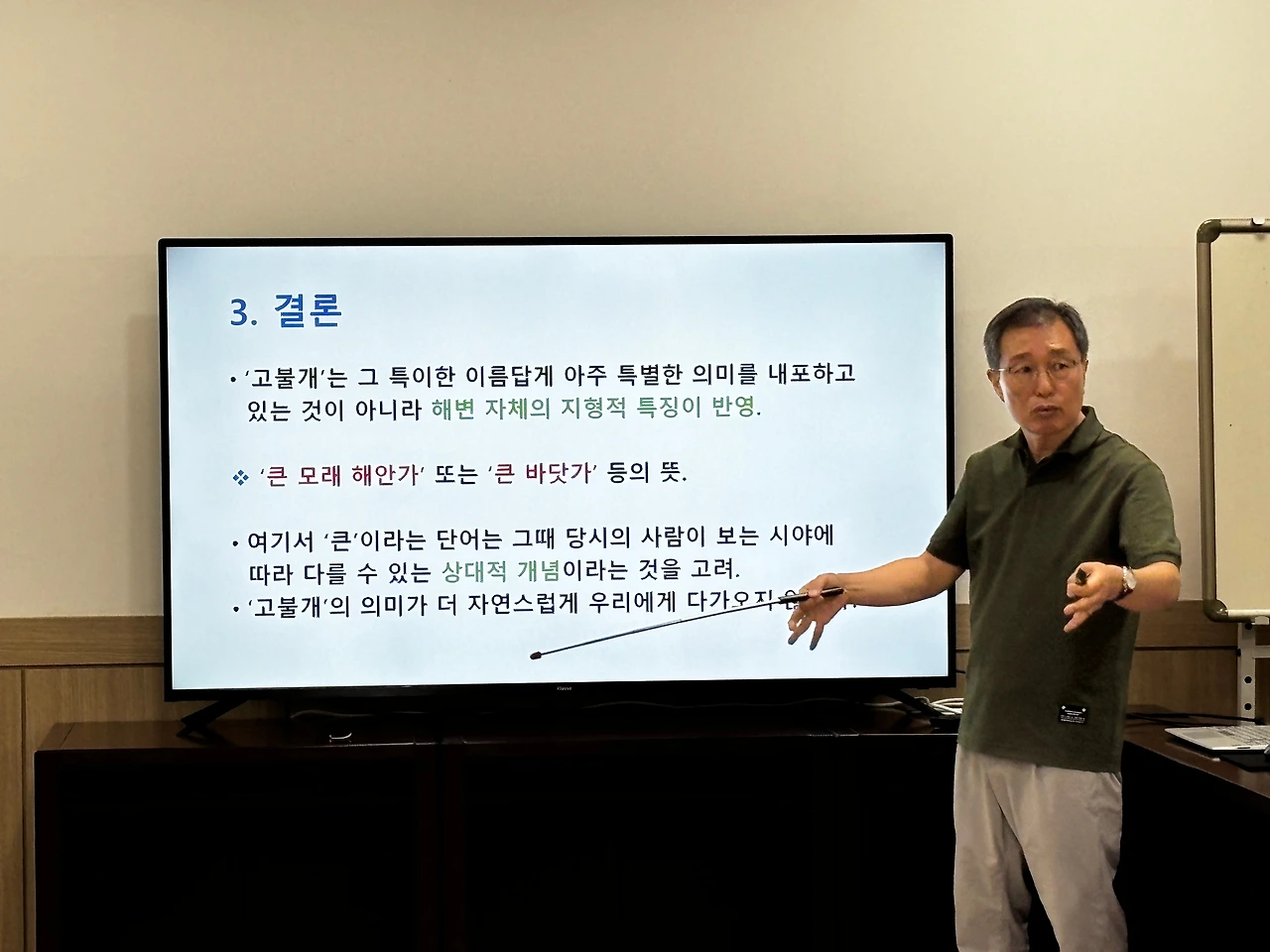 두 번째 주제는 동해시 천곡동 해안가에 위치한 ‘고불개’라는 지명의 유래였다. ‘고불개’라는 이름은 처음 들으면 그 자체로 신비롭고 특별한 의미를 담고 있을 것 같지만, 실상은 지리적 특성을 반영한 매우 단순한 의미를 가지고 있다. 강위원에 따르면, ‘고불개’는 ‘큰 모래 해안가’ 또는 ‘큰 바닷가’를 의미하며, 여기서 ‘큰’이라는 표현은 당대 사람들이 바라보는 관점에 따라 상대적인 개념일 수 있다. 즉, 고불개라는 이름은 그 자체가 특별한 상징이나 역사를 내포한 것이 아니라, 그저 그곳의 지형적 특징을 묘사한 것일 뿐이다.