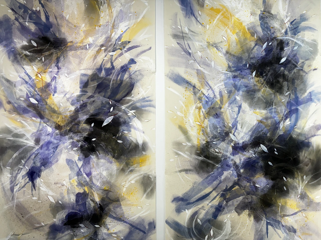 A. 저는 잘 표현은 안 해요. 원래 작품 소개도 없어요 작품을 보는 사람 그 느낌이 정답이 아닐까요. 저는 보이는 것만 그려야 한다고 생각하지 않아요. 또 내가 그림을 그리는 작가로만 멈추는 부분도 이해가 가질 않아요. 저는 제 그림 속으로 들어가는 걸 즐기고 지금의 현상을 그려요. 바로 그림 속 작은 모양들은 바로 저입니다. 더 가까이서 안아주고 싶기 때문입니다. 그래서 굳이 작품이름을 붙인다면 ‘Hug’로 말할 수 있습니다. “라고 답했다.