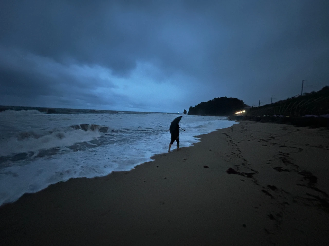 바람은 파도를 백사장 끝까지 밀어내며 사나운 힘을 과시했다. 빗물은 우비를 뚫고 얼굴을 때렸고, 안경은 빗물로 범벅이 되어 시야를 가렸다. 결국 나는 안경을 벗어 손에 쥐고, 흐릿해진 풍경 속에서 그저 발바닥의 감각에만 집중하기로 했다. 네 번의 왕복. 발끝이 백사장을 스치는 그 느낌, 그리고 바람이 온몸을 휘감는 그 순간 속에서 나는 자연과 하나가 된 듯한 느낌을 받았다.