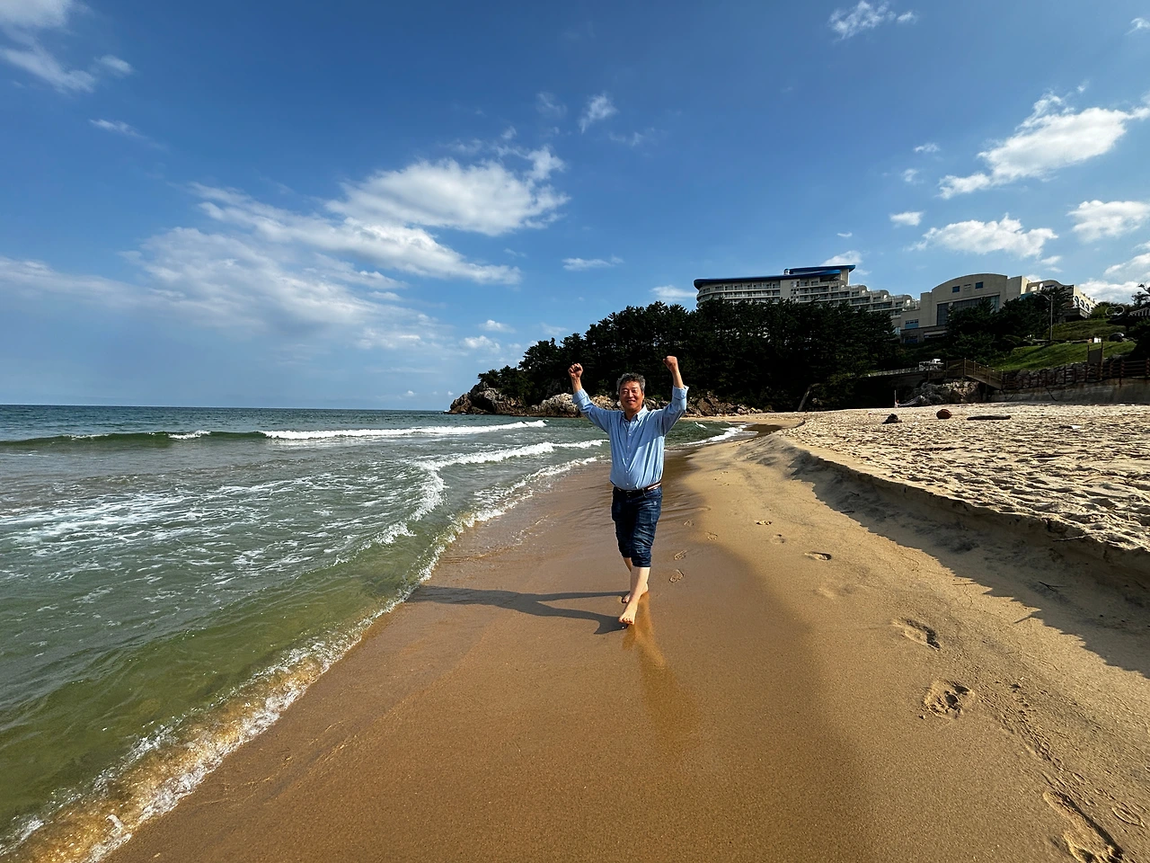맑은 하늘과 잔잔한 파도가 맞이해 주는 동해 추암해변에서 맨발 걷기 326일 차를 보냈다. 삼척 방향 증산 쪽에 차를 세우고, 해변 북쪽을 향해 걸음을 내디뎠다. 평소 술자리와 장거리 운전이 잦은 연출자와 함께했다. 연출자는 최근 삼척시에서 열린 제30회 강원민속예술축제에서 시 대표팀의 민속 연출을 담당하며, 지난 4개월 동안 동해와 서울을 오가며 지도를 해오던 임웅수 대한민국농악연합회 이사장이다.