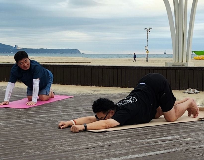 가을 아침, 수평선을 붉게 물들이며 떠오르는 태양이 새로운 희망을 약속한다. 맨발 걷기 동해클럽의 '요가랑 걷기, 위크앤드 클래스'가 동해 망상해변 고래꼬리 광장과 해변에서 29일 아침 진행됐다. 이곳에서는 매 주말마다 맨발의 즐거움과 요가의 평화를 동시에 체험할 수 있다. 개인적으로 맨발 걷기 307일 차를 맞이한 저는 오늘도 그 어느 때보다 발걸음이 가벼웠다. 요가 지도자 김나경 박사의 따뜻한 격려 아래, "몸의 자세가 많이 좋아졌다"는 칭찬을 받으며 회원들과 잠시나마 웃음꽃을 피웠다.