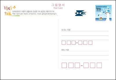 논골담길 영원 그림엽서는 2014년 세계 우표 전시회 전시를 위해 같은 해 8월 제작된 엽서다. 논골 3길 이야기 벽화 중에서 필자가 촬영한 ‘논골상회’ 사진을 김소정 디자이너가 디자인을 담당했다.