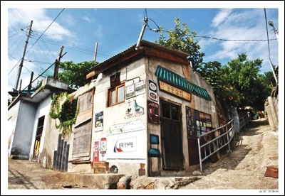 엽서의 배경 논골상회는 이미 50년 전 실제 마을에 있던 소규모 동네 상점 장소다. 마을 이야기를 구술하던 2010년 이야기 벽화로 재생한 곳으로 ‘논골상회’ 이름은 필자가 직접 지었다.