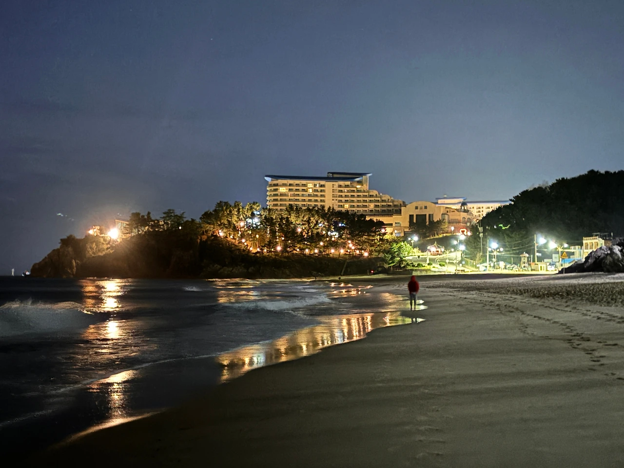 은은한 해변의 여명 속에서 은하수 조명 아래 드러나는 촛대바위와 증산 방향의 솔비치 리조트는 마치 좌청룡과 우백호가 바다를 지키고 있는 모습처럼 웅장하다. 해변을 따라 걷는 이들에게 이 장면은 그들이 삶 속에서 마주하는 힘과 용기, 그리고 자신을 지키려는 의지를 비추는 거울이다.