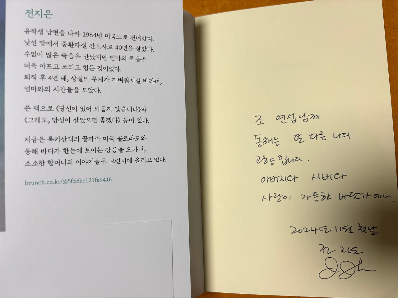 작가는 현장에서 구입한 나의 ‘오롯한 나의 바다‘ 책 첫 장을 펼치고 “두타산 무릉계를 배경으로 쓴 시를 기념한 아버지의 시비 ’ 낙조‘가 세워진 두타산 무릉계, 사랑이 가득하고 해파랑이 넘실대는 바닷가 ‘동해’는 또 다른 나의 고향이다.”라고 적으며 잠시 그리운 아버지를 소환하는 듯한 느낌이다.