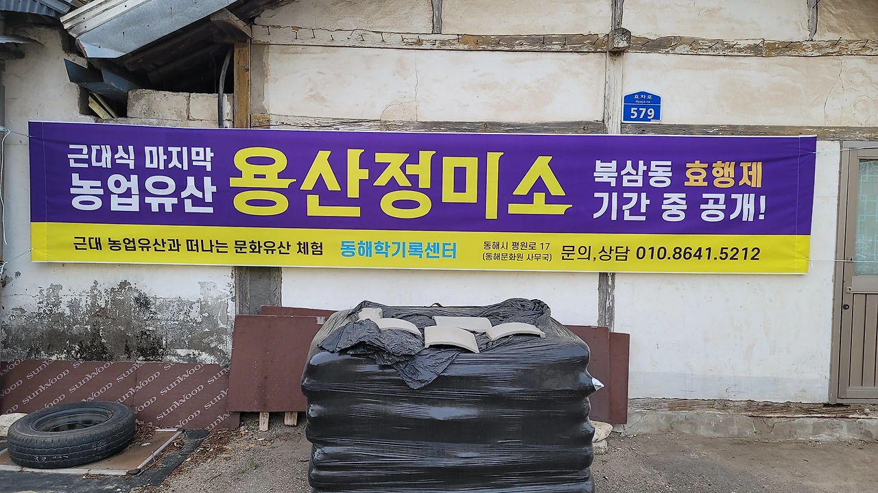 "동해시 북삼동 용산서원 뜰에서 개최된 마을축제 '효행제' 기간 중 지역 생활문화와 애환을 담은 '용산정미소'를 정비하고 기간 중 공개 행사를 개최했어요. 강릉 산불을 발생시켰던 바람은 동해에서도 큰 피해를 가져왔는데 용산 정미소도 함석지붕이 날아가 버렸죠. 이 불을 계기로 철거 위기에 놓인 정미소를 정비해 시민들에게 공개하고 시설 보존에 대한 공감대를 얻고자 공개하게 됐죠.