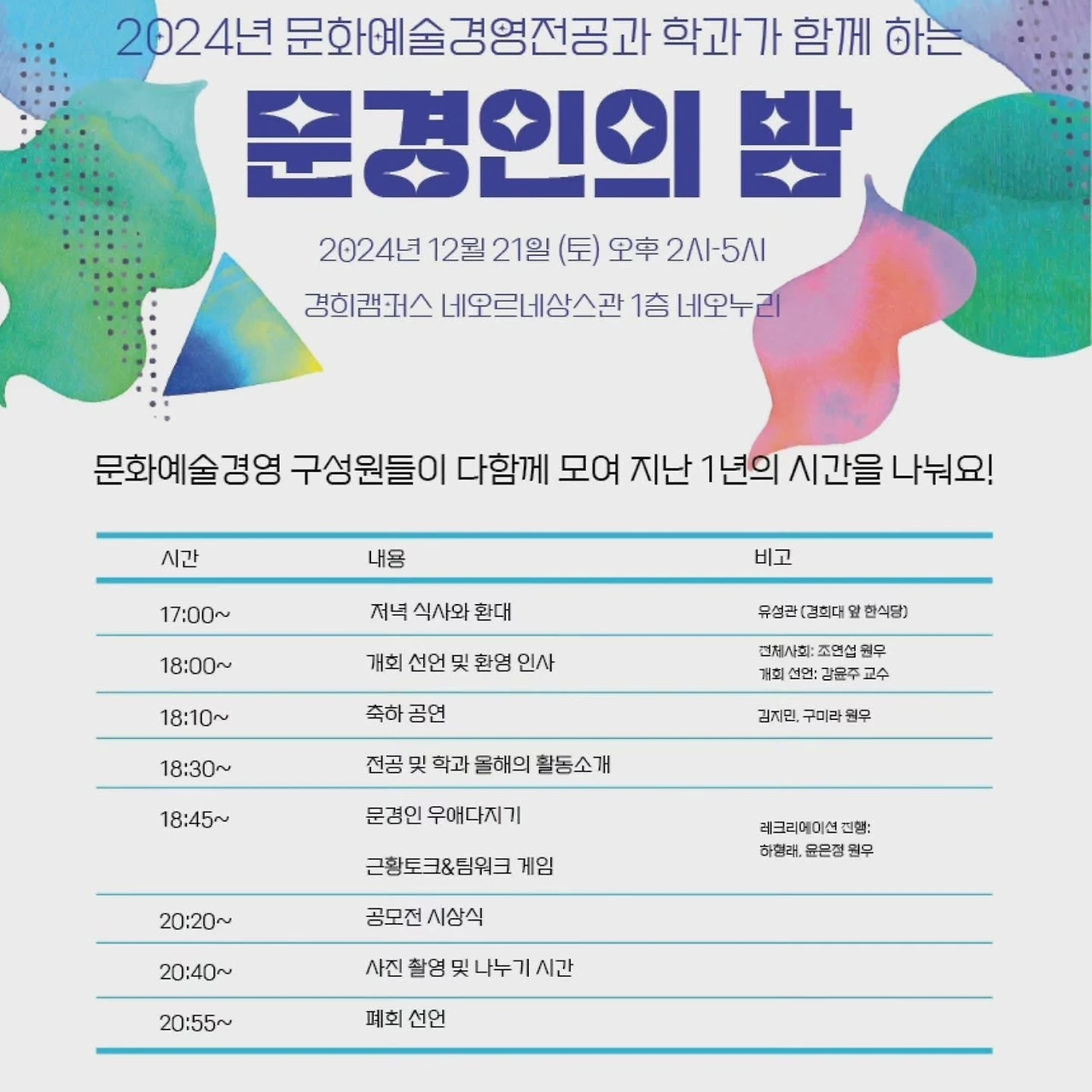 이번 문경인의 밤은 두 가지 축으로 진행된다. 1부는 학술대회로, 문화예술경영 전공의 원생들과 교수진이 한 해 동안 연구한 논문발표 와 결과물을 공유하고 토론하는 시간이다. 이 자리는 문화와 예술, 그리고 경영의 다양한 관점을 학습하고 서로의 아이디어를 나누는 소중한 기회다. 학문적 깊이를 더하는 이 시간은 참석자들에게 지식의 확장은 물론 전문적 네트워크 형성이라는 또 다른 의미를 제공한다.