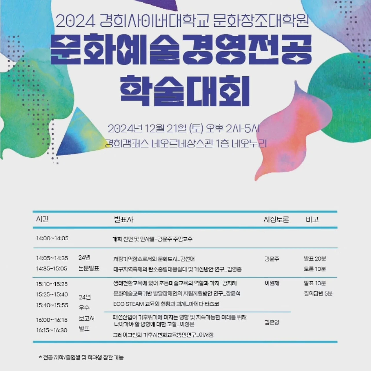 12월의 끝자락, 연말 특유의 설렘과 아쉬움이 교차하는 이 시기에 경희사이버대학교 대학원은 특별한 날을 맞이했다. 바로, 대학원 문화예술경영 전공 학술대회와 문경인(문화예술경영 전공자)의 밤이 열리는 날이다. 이 행사는 그냥 한 해를 마무리하는 것이 아니라, 원생들과 교수진, 동문들이 한자리에 모여 학문적 성과를 나누고 네트워크를 확장하는 자리로 마련되었다. 특히, 온라인을 기반으로 이루어져 온 디지털 대학원이라는 독특한 교육 환경에서 이루어진 오프라인 축제라는 점에서 더욱 큰 의미를 지닌다.