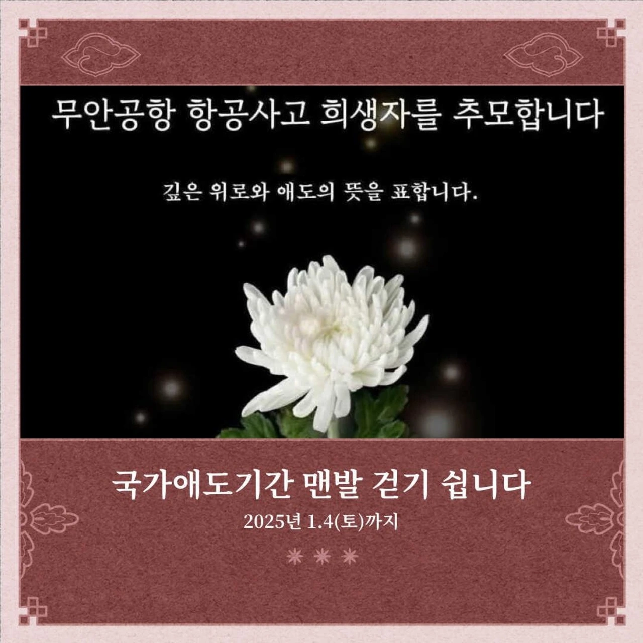 29일 무안에서 발생한 항공기 사고관련 “맨발 걷기 동해클럽” 회원 일동은 애도 기간인 새해 4일까지 모든 일정과 맨발 걷기를 중단하기로 했다. 우리 모두의 가슴을 먹먹하게 한사고로 소중한 생명을 잃은 희생자와 그 가족들에게 깊은 애도를 표하며, 부상자들의 빠른 회복을 기원한다. 이번 사고는 우리가 안전을 어떻게 관리하고 생명을 어떻게 존중해야 하는지를 다시금 일깨워주는 중요한 사건이다.