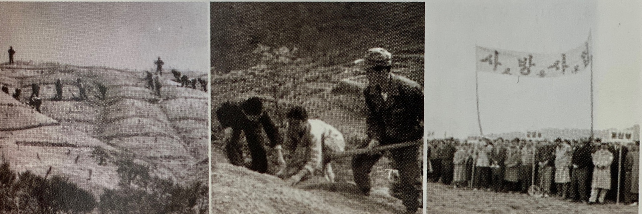 그러다 보니 붉은 땅이 많은 산에 큰비만 왔다 하면 동시다발로 산사태가 생겨 동네마다 말이 아니었지요. 재건국민운동사업의 하나로 사방사업砂防事業이 전국 곳곳에서 이루어졌지요. 북평읍에서도 5명의 '사방수'를 모집했는데, 나는 효가리, 천곡리, 쇄운리 일대의 산을 담당했는데 3년 간 근무했지요. 나무 없는 경사지를 남자들이 삽과 곡괭이로 계단식으로 만들고 구덩이를 일정한 간격으로 파놓아요. 그러면 여자들이 엄지 손가락 굵기의 아카시아 나무를 심고 물을 한 바가지 준 다음, 흙을 덮어 발로 꾹꾹 밟아 다져놓았어요. 나는 1년 후, 공사현장을 돌아다니며 살아있는 아카시아에 귀한 비료를 한 주먹씩 주었어요. 왜 직접 주었는가 하면, 당시 비료가 워낙 귀해 도난 위험이 컸기 때문이었지요.