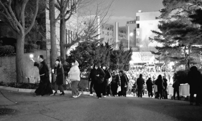 이 사진은 한밤중에 펼쳐진 한 장면 이상의 이야기를 담고 있다. 한남동에 모인 수많은 시민들, 부족한 화장실 문제를 해결하기 위해 자신들의 공간을 내어준 수도원, 그리고 신부님이 응원봉을 들고 시민들을 안내하는 모습. 이는 단순한 배려를 넘어, 연대와 나눔의 본질을 보여주는 장면이다.