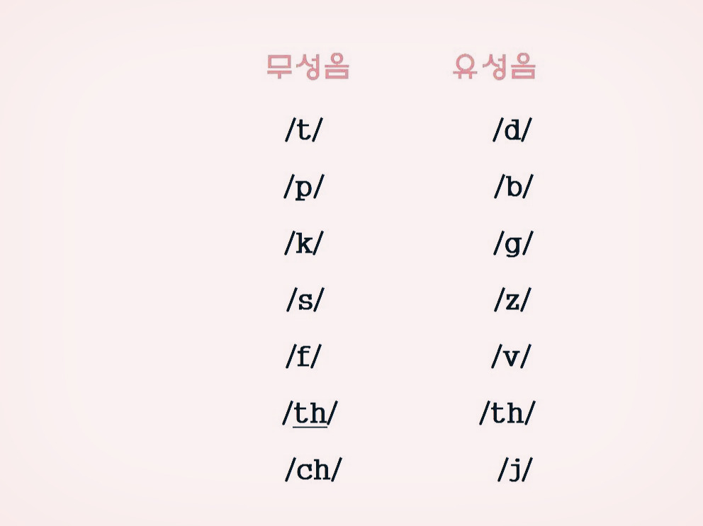 짝을 이루는 자음소리값은 나머지의 요소, 즉 입술의 모양과 혀의 위치 그리고 공기의 흐름은 모두 동일하고 only 성대의 울림유무에 따라 구별되는 소리입니다.