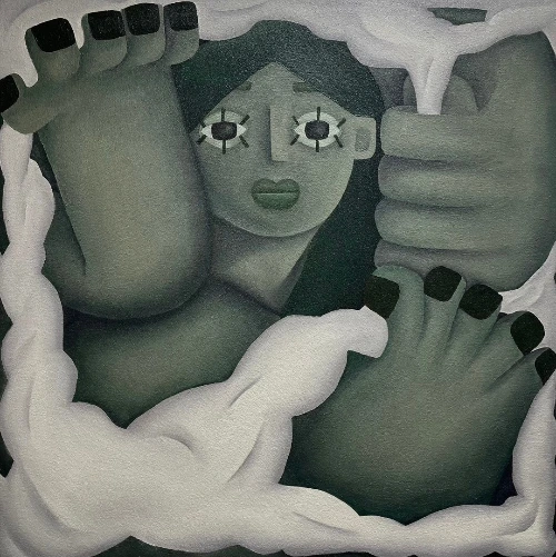 안신주의 작품 속 여성들은 네모난 캔버스 안에 몸을 구겨 넣은 채로 갇혀있다. 하지만 이들은 캔버스 안에서 가만히 있는 것이 아니라 <A world that smells like secondhand smoke>(2022)처럼 마치 캔버스 밖으로 뚫고 나올 것처럼 몸부림을 치고 있다. 안신주의 작품은 사회적으로 구속받고 제한되는 여성의 신체를 표현함과 동시에 그러한 제약으로부터 벗어나고자 하는 여성들의 욕구를 표현한다. 이번 전시 《박스 속의 여성Boxed Girl》은 이러한 작가의 주제 의식과 함께 여성이 사회에서 겪는 여러 압박과 한계에 대한 관객의 관심을 유도한다.