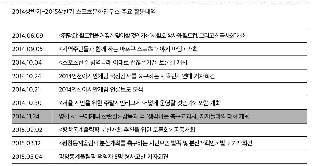 위 표 칸에 ‘영화 <누구에게나 찬란한> 감독과 책 <생각하는 축구교과서> 저자들과의 대화 개최’를 강조한 이유는 10개의 행사 중 유일하게 내가 기획한 행사이기 때문이다. 2015년 6월 경 석사 논문을 쓰려고 간사활동을 중단했지만 2016년 1월 논문 통과가 되자 당시 이대택 소장이 축하한다며 저녁을 사주었다. 밥과 술을 많이 마셔서 그런지 전보다 5배 높은 연봉으로 계약을 체결하여 1월 중순부터 월 100만원을 받으며 다시금 간사로 근무를 하게 됐다.
