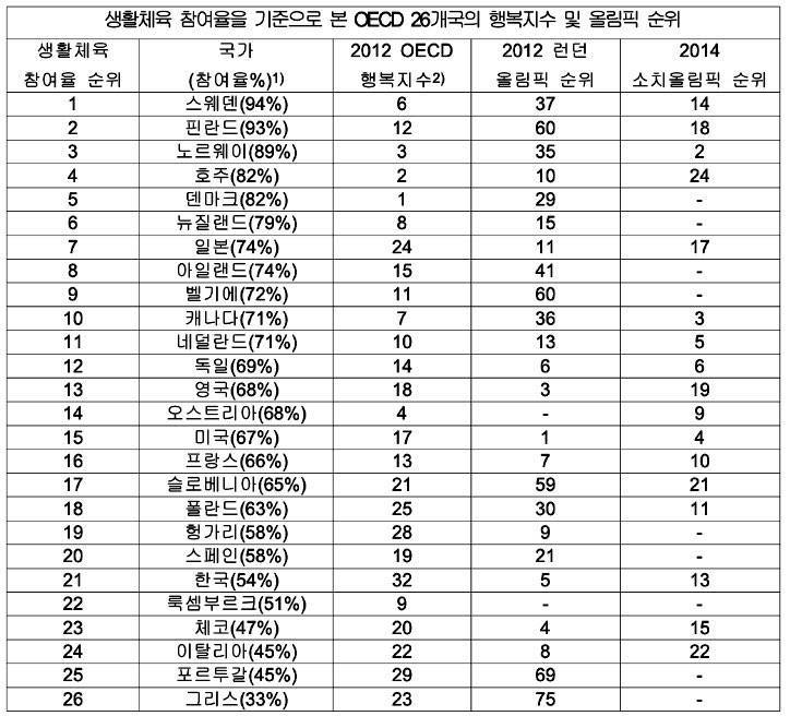 과연 생활체육 참여율이 높을수록 올림픽 성적도 높을까. OECD 가입 30개 국가 중 26개국의 생활체육 정책 유형을 연구한 논문(조욱연.2012)을 보면, 2010년 즈음 OECD통계 자료, 유럽공동체 통계청Eurostat 등 각국의 통계자료로 추려낸 26개국의 생활체육참여율을 확인할 수 있다. 아래에 이 자료와 2012년 런던올림픽의 순위를 대조해보겠다. 재미로 OECD 가입국의 행복지수도 추가해본다.