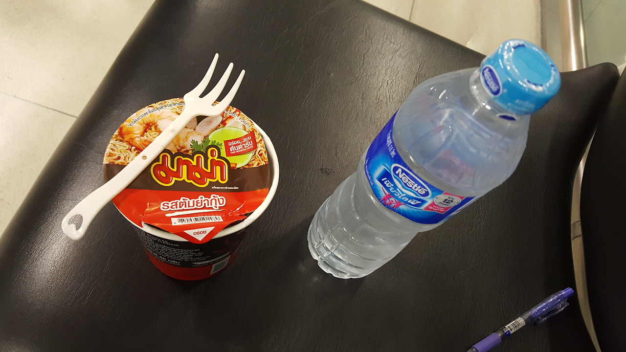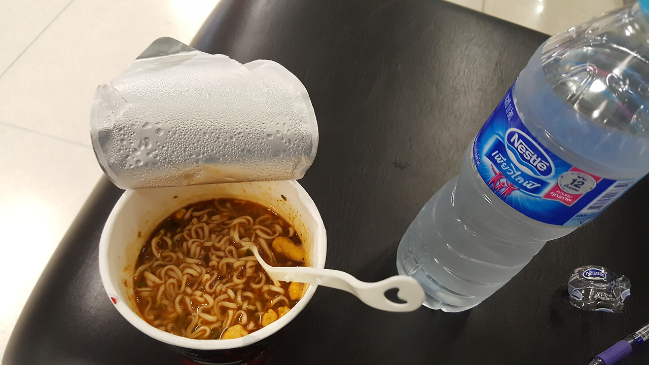 이렇게 방콕에서 돈을 만지자마자 첫 거금을 쓰고는 뭐라도 먹자는 생각에 편의점으로 향했다. 세븐일레븐의 천국인 태국, 역시나 공항 편의점도 세븐일레븐이었다. 그런데 딱히 땡기는 게 없었다. 고민 끝에 생수 한 병과 똠양꿍 국물 맛 컵라면을 하나 샀다. 그런데 컵라면에 뜨거운 물을 부으러 갔더니 헉, 그 앞에 벌레들이 널브러져 있다. 심지어 직원들은 대수롭지 않은 듯 그냥 지나간다. 아, 그래 여긴 태국이지. 첫날부터 뜻밖의 상황에서 마음을 다잡았다.