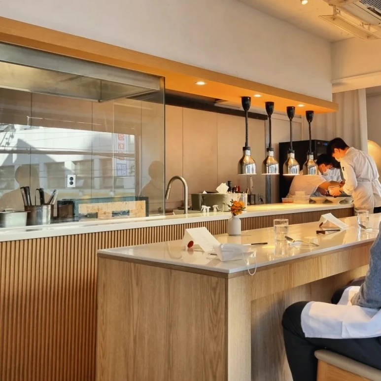 도착하면 우드 톤으로 깔끔하게 잘 꾸며져 있는 공간이 나와요. 그리 큰 레스토랑은 아니지만, 파인다이닝으로써는 충분한 공간을 가지고 있다는 생각이 드는 가게입니다. 저는 테이블 자리를 예약해서 먹었는데, 바 자리에서는 오픈 키친에서 셰프님들이 요리하는 모습을 볼 수 있기 때문에 테이블 자리에서 먹었어도 재밌었겠다 싶었습니다.
