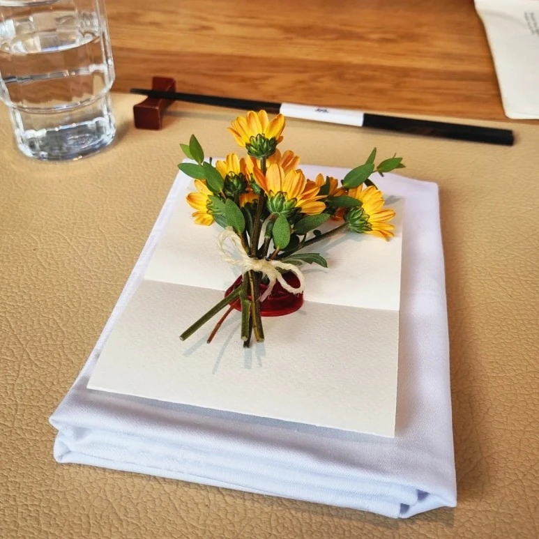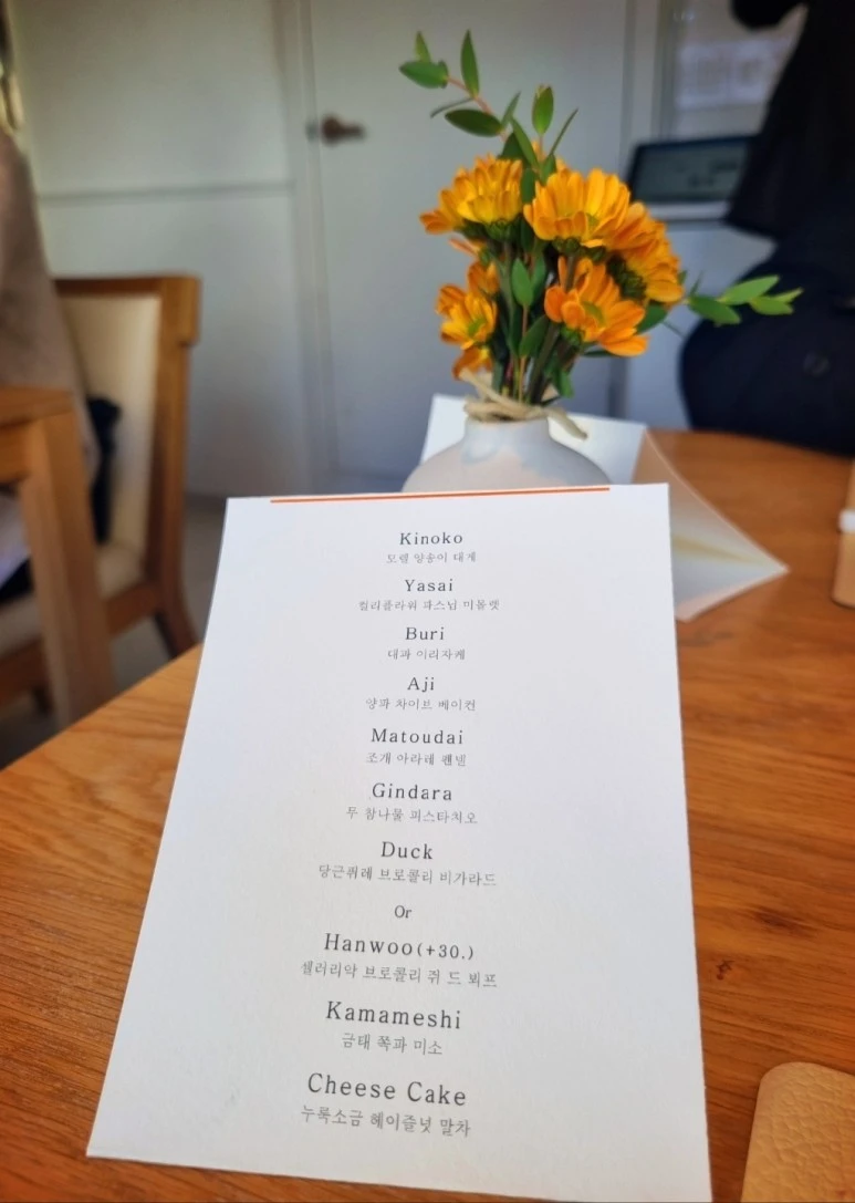 메뉴판. 꽃은 화병에 꽂아준다 이 집의 가장 큰 매력 포인트 중 하나는 메뉴판과 꽃이 아닐까 싶어요. 시즌마다 바뀌는 꽃을 메뉴판 위에 올려주시거든요. 메뉴판도 붉은색 인장으로 봉인되어 있어서 펼쳐보는 재미가 있었습니다. 다 펼치고 나면 아래 사진처럼 세로로 세워주시고, 꽃은 화병에 꽂아주시더군요. 여러모로 시작부터 재밌는 경험이었습니다.