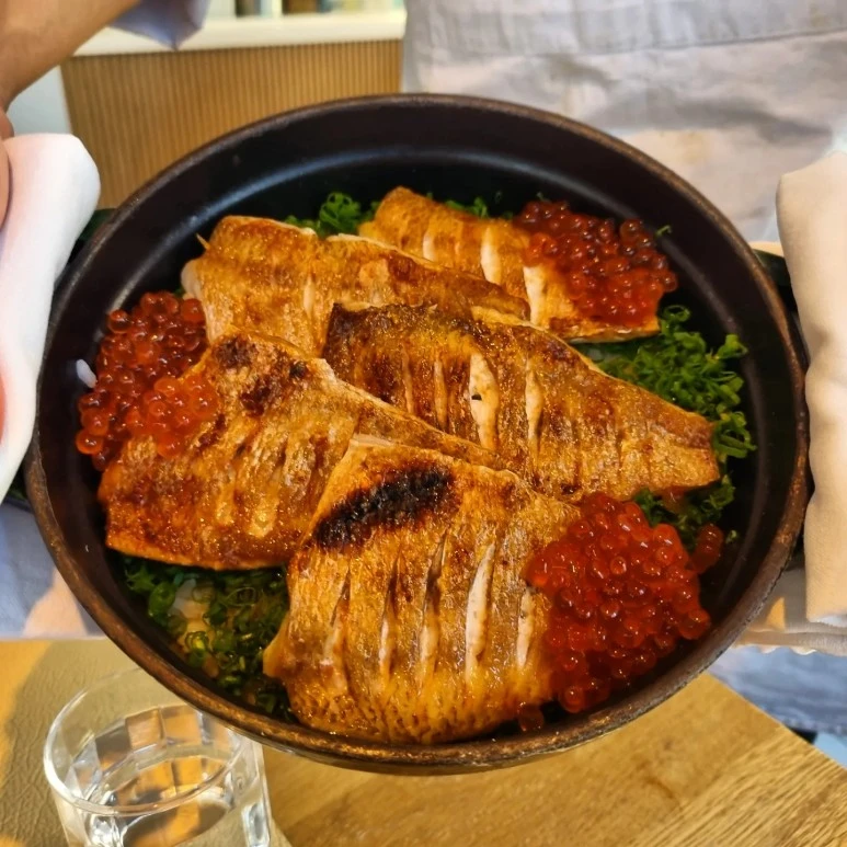 방어회를 숙성한 요리였어요. 이리자케 요리라 하셨으니 일본 술에 우메보시, 가다랑이 포 등을 넣고 끓인 소스에 담궈 숙성하셨겠구나 싶습니다. 이날 인상 깊게 먹었던 음식 중 하나였습니다. 소스에 숙성해서 그런지 회가 정말 부드럽게 넘어가더라구요. 자칫하면 물컹하고 부서질 수 있어서 스푼으로 먹을 수 있게 스푼을 주셨는데 성질 급한 저는 젓가락으로 냠냠 맛있게 먹어버렸습니다. 적당한 산미의 소스도 회의 맛을 해치지 않고, 오히려 입맛을 돋우어 주어서 맛있었어요.
