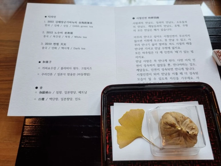 <시절 인연>은 한 번에 최대 6명까지만 참석할 수 있는데요, 자리에 앉으면 신청자의 이름이 적혀있는 다회 구성표를 받게 됩니다. 다회 구성은 차 3종과 다식 2종, 그리고 향 2종이 적혀있어요. 추가적으로 대표님조차 미리 메뉴를 알 수 없는 이날의 식사가 제공되는데요, 먼 길 고생하면서 온 손님들을 빈속으로 집에 가게 할 수는 없다는 어머님의 따뜻한 마음으로 시작된 메뉴라고 해요. 그래서 그런지 몰라도 이곳에서 먹은 식사는 항상 든든하고 맛있게 먹고 가게 되곤 합니다.