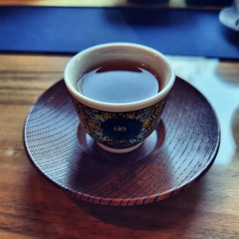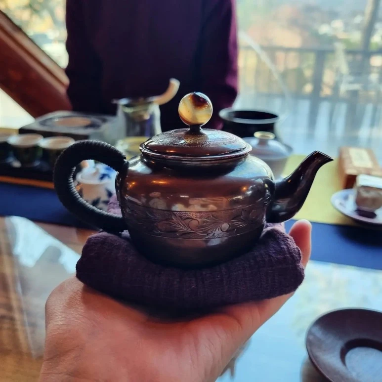 이번 차는 독특하게 자사호가 아닌 동주전자로 끓여주셨는데요, 동주전자 특유의 철분이 차와 어우러져서 차에도 철분 맛이 함께 묻어 나왔습니다. 그리고 이 철분 맛은 오히려 차의 맛을 끌어올리는 역할을 했는데요, 흑차가 자칫하면 쓰고 떫을 수 있는데, 그 맛을 철분 특유의 산미로 잡아주기 때문이었어요. 호불호가 갈릴 수도 있긴 하지만 동주전자로 차를 끓이는 것 역시 차를 특별하게 즐기는 하나의 방법이 될 수 있다는 걸 처음 알게 된 순간이었습니다.