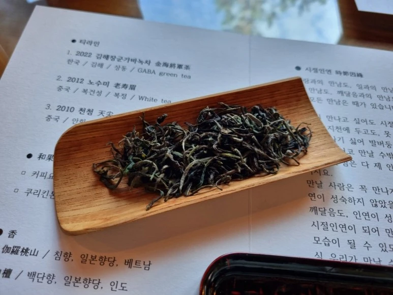 첫 번째 차는 <2022 김해장군가바녹차>였습니다. 김해가 차로 유명해진 이유는 아무래도 바로 이 <장군차>때문인데요, 발효차 부문에서는 현재 대한민국에서 계속 1위를 하고 있는 차라고 합니다. 그래서 그런지 몰라도 실제로 마셨을 때 살짝의 산미와 함께 부드럽게 넘어가는 목 넘김이 정말 훌륭했던 차였는데요 사실 이날 마셨던 차 중 가장 맛있는 차이기도 했습니다.