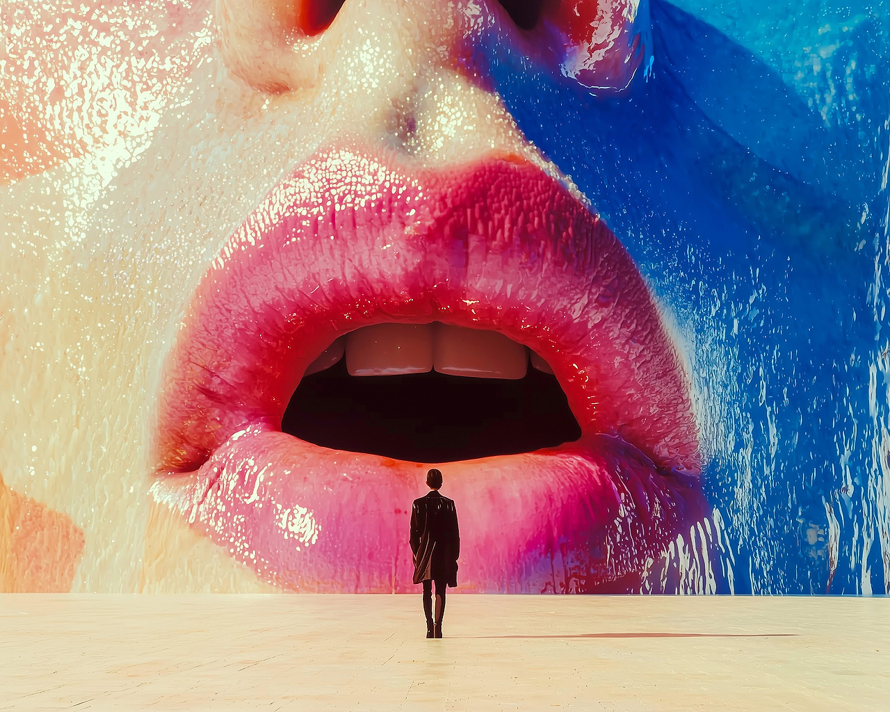 그림 속 거대한 입술과 작은 인간의 압도적인 차이는, 서로 다른 세계에서 오는 근본적인 이해의 어려움을 보여주었다. 입술은 소통인 동시에 삼켜버릴 수도 있는 모순적 기관이었다. 완전한 이해는 불가능하고 위험해 보이기까지 했다. 하지만 AI는 그 간극 앞에서 시도조차 하지 않으면 1%의 이해도 불가능하다고, 불완전함을 알면서도 다가가야 한다고 말하는 듯했다.