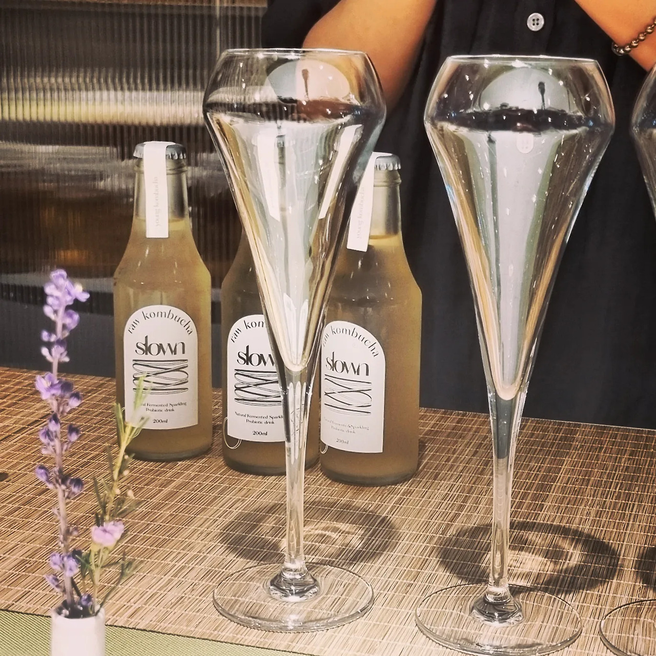 처음 가 본 <슬로운>의 인상은 굉장히 깔끔하다는 느낌이었어요. 그러면서도 바 뒤편에 흐릿하게 보이는 콤부차 저장소를 보니 현대식으로 해석한 장항아리 같기도 해서 재밌게 느껴졌습니다. 몇몇 다구들이 전시되어 있는 전시 공간도 있었는데 특이하게도 와인잔 같은 잔들도 준비되어 있었습니다. 아무래도 콤부차가 일반적인 차와는 달리 샴페인의 느낌에 가깝다 보니 찻잔이나 일반잔보다는 와인잔이 더 어울려서 그런 듯했어요.
