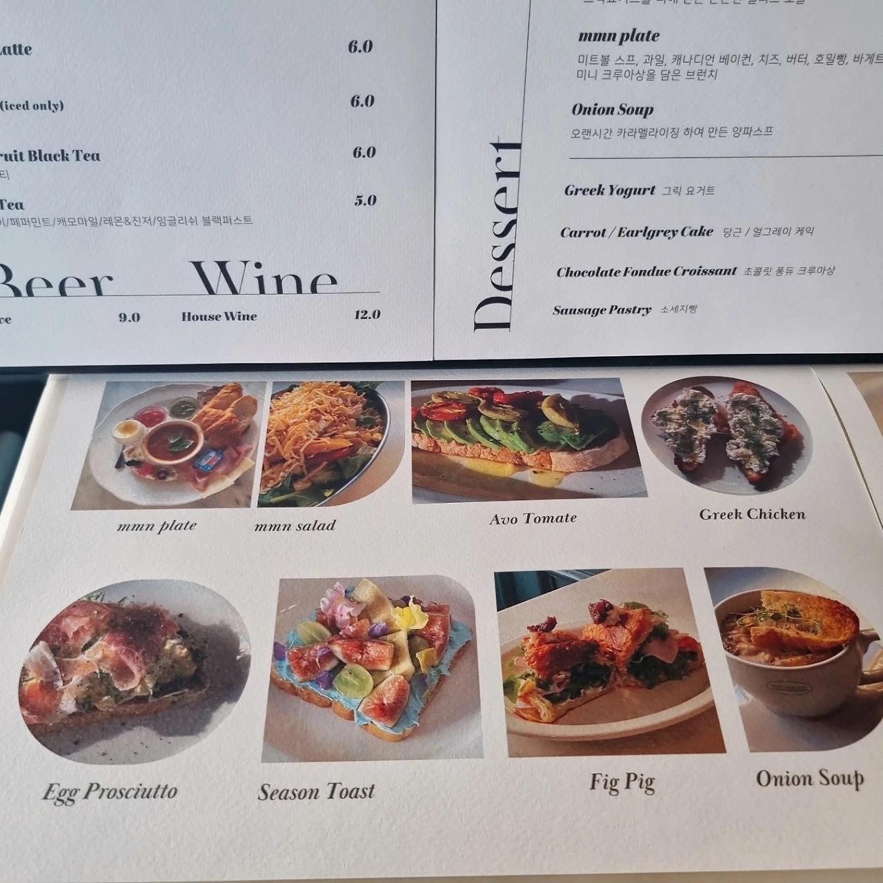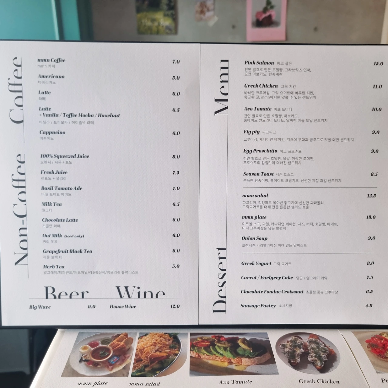 메뉴 전체 샷 <MMN>은 위치는 그렇게 좋은 편이 아니지만, 방문하는 사람들이 어떤 메뉴에 매력을 느낄지 확실하게 아는 가게였어요. 시그니처 메뉴인 그릭 치킨에는 향긋한 허브 달을, 당근 케이크 위에는 분홍색 크림을, MMN 커피에는 마들렌을. 이렇게 작은 포인트지만 다른 가게에서는 접하기 힘든 포인트를 확실하게 주어서 이 집에 다시 방문하고 싶지 않을 수 없게 만드는 매력적인 가게였습니다. 가게의 청록색 외관도 주변의 분위기를 확 사로잡아서 기분 좋게 만들구요. 기회가 된다면 허브 향과 다채로운 색채의 매력을 다시 한번 느끼기 위해서라도 다음에 또 들러봐야겠습니다.