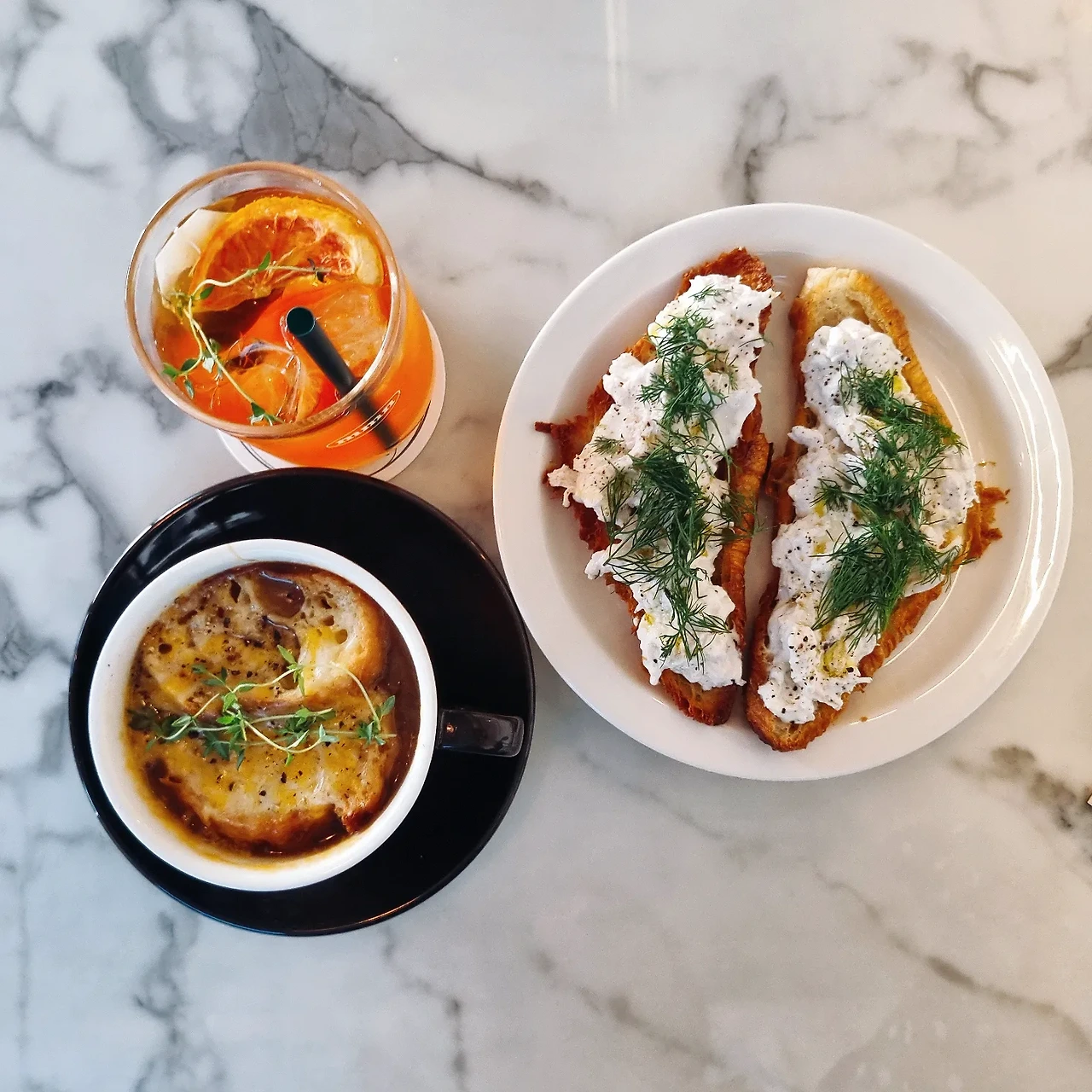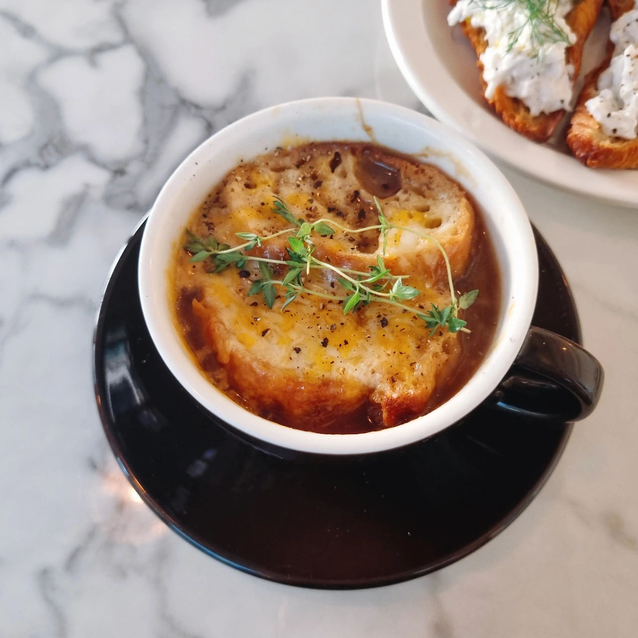 분홍색 크림이 올라온 이쁜 당근 케이크부터 과일이 올라온 토스트, 먹음직스러운 샌드위치까지. 시키고 싶은 메뉴가 가득했지만 제가 이 집에 온 이유는 단 두 개! 평소에도 너무 좋아하지만 찾아가서 먹기는 어려운 <어니언 수프>와 다른 집에서는 볼 수 없는 시그니처 메뉴 <그릭 치킨>을 먹을 수 있다! 검색해서 찾아봤을 때도 두 메뉴가 너무 궁금해서 꼭 먹어보고 싶었거든요. 그래서 망설임 없이 양파 수프와 그릭 치킨을 시키고, 음료로는 자몽 블랙 티를 주문해 보았습니다.